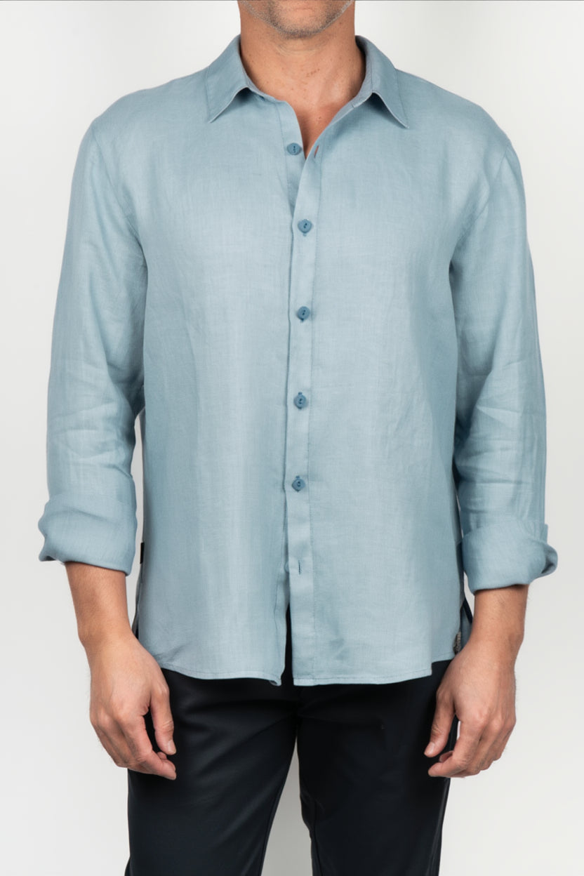 Camisa de hombre de manga larga en azul cielo, con diseño liso y silueta recta de apariencia ligera. Incorpora cuello clásico, cierre frontal de botones y puños abotonados, creando una imagen limpia y equilibrada. La superficie muestra una textura visual sutil que aporta relieve al color y refuerza su carácter natural, mientras la estructura favorece una caída cómoda y una sensación fresca en el conjunto.