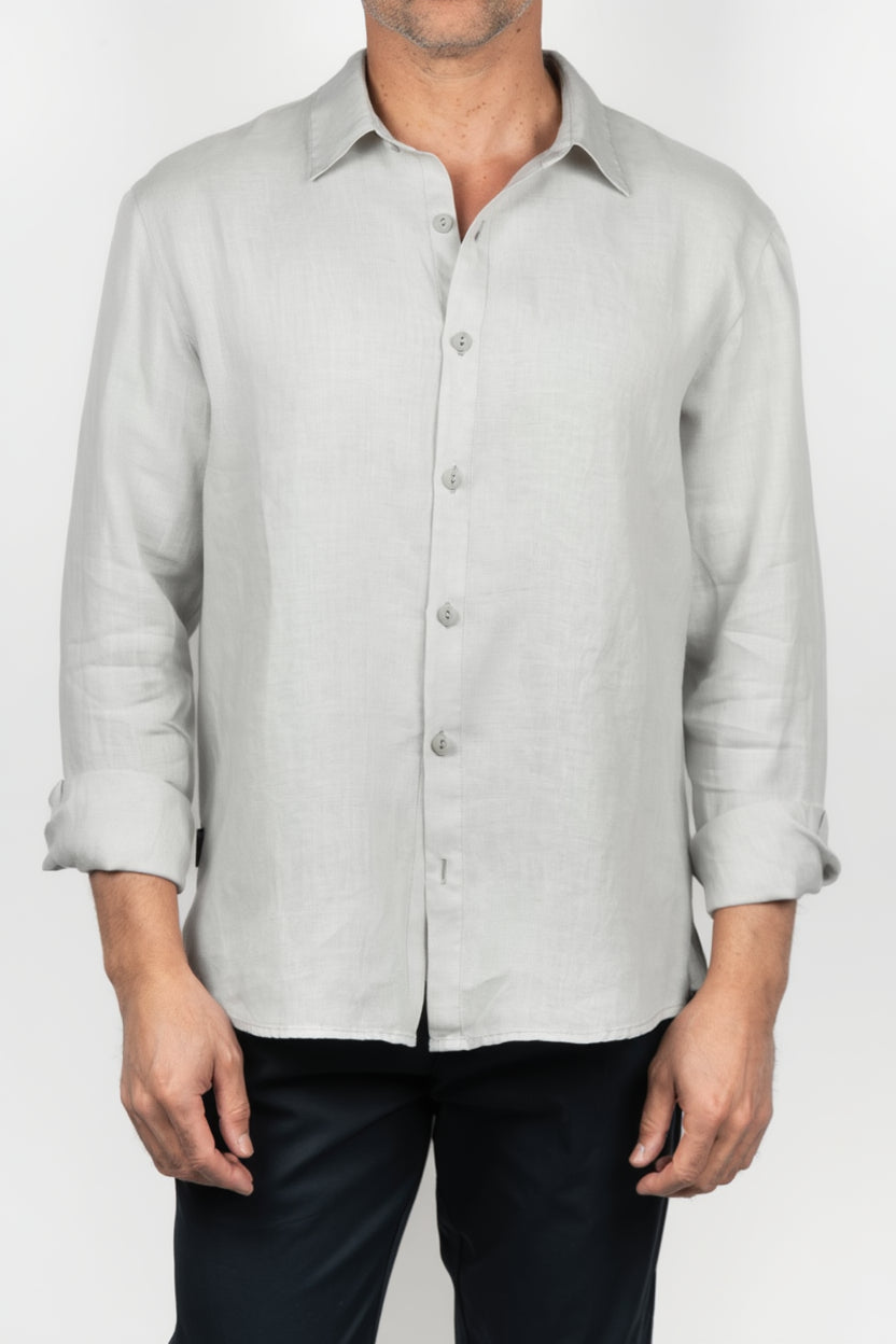 Camisa de hombre de manga larga en tono blanco roto, con silueta recta y diseño liso de apariencia natural. Presenta cuello clásico, cierre frontal de botones claros y puño abotonado, con una superficie de textura visible que aporta profundidad y un carácter relajado al conjunto. La estructura se percibe ligera y flexible, favoreciendo una caída cómoda y una imagen limpia, serena y fácil de llevar.