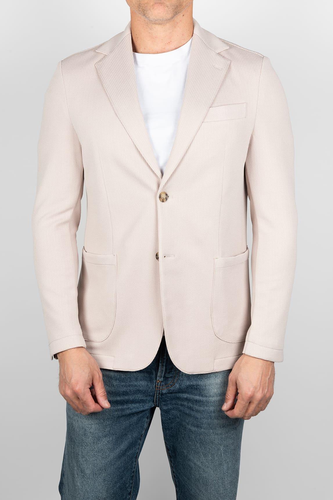 Americana de hombre Boreal con silueta entallada y estructura ligera, presentada en tono beige con una superficie de textura sutil que aporta profundidad visual sin recargar el diseño. El modelo incorpora solapa clásica, cierre frontal de dos botones, bolsillo superior de vivo y bolsillos de parche en la parte delantera, manteniendo una imagen equilibrada entre lo relajado y lo pulido. La construcción se percibe flexible y cómoda, con una línea limpia que acompaña el cuerpo sin rigidez.
