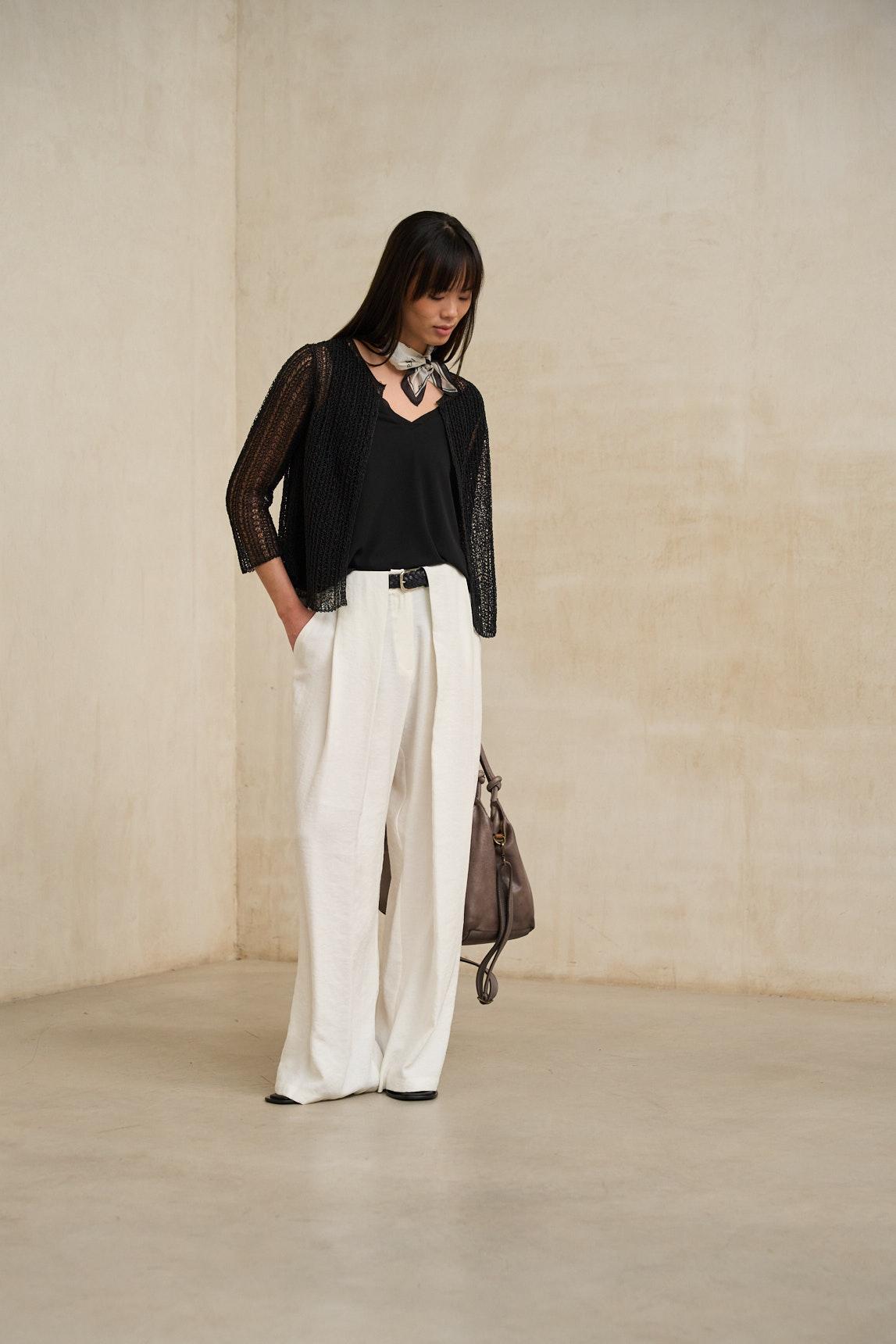 Chaqueta de mujer confeccionada en punto ligero con textura calada y caída fluida. Su diseño abierto, sin cierres, potencia la sensación de ligereza y movimiento, mientras que la manga tres cuartos equilibra la silueta con un aire contemporáneo y sofisticado. El tejido presenta una transparencia sutil y elegante que aporta profundidad visual y un efecto de capas muy cuidado. Está pensada para superponer sobre tops o vestidos base (no incluidos), creando contraste y dimensión en el estilismo. En negro, se convierte en una pieza versátil y atemporal. Funciona tanto para looks minimalistas en blanco y negro como para estilismos más sofisticados en tonos neutros o intensos, aportando estructura sin perder ligereza. Nos esforzamos por mostrar los colores de la forma más fiel posible, pero pueden variar ligeramente respecto a la realidad.