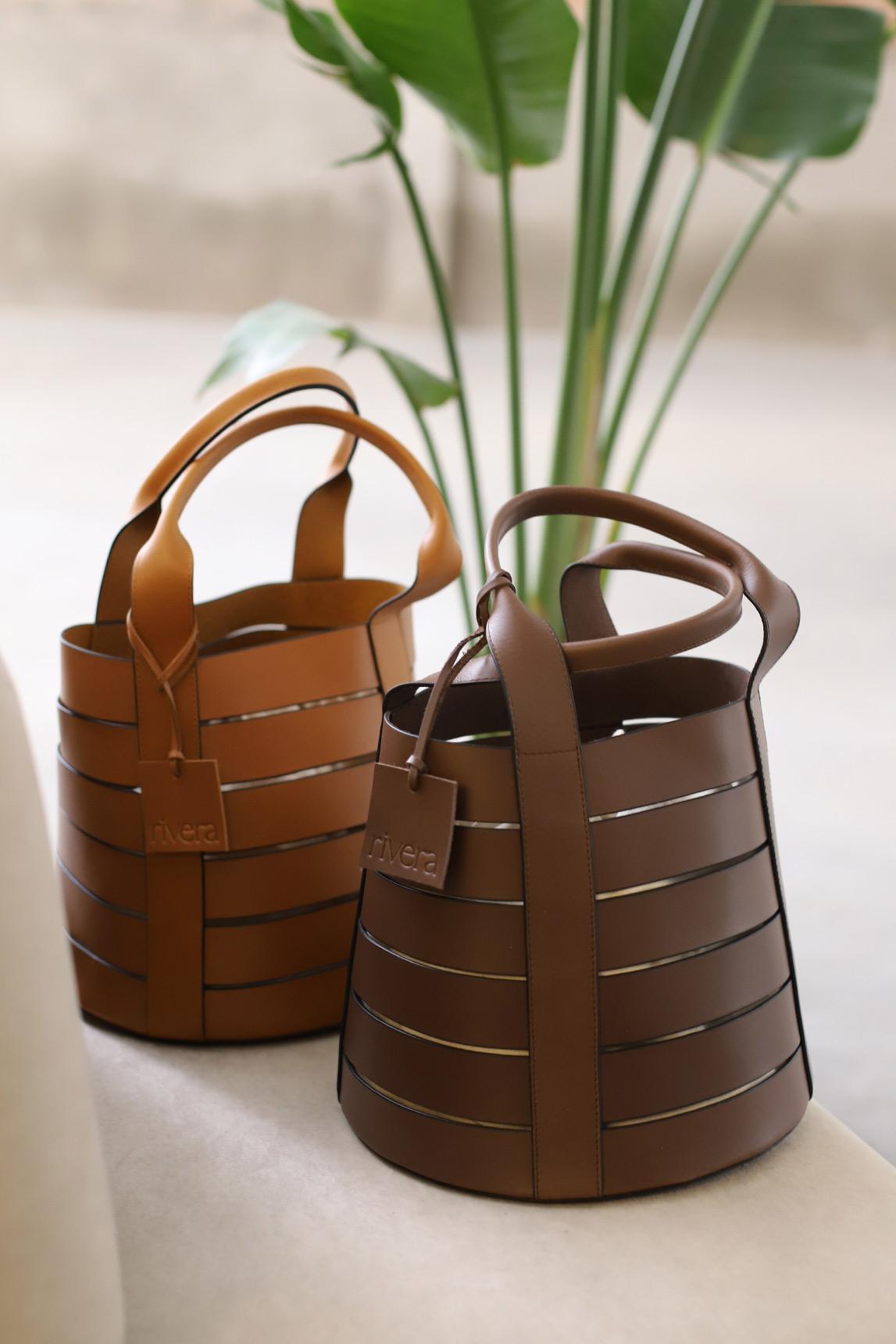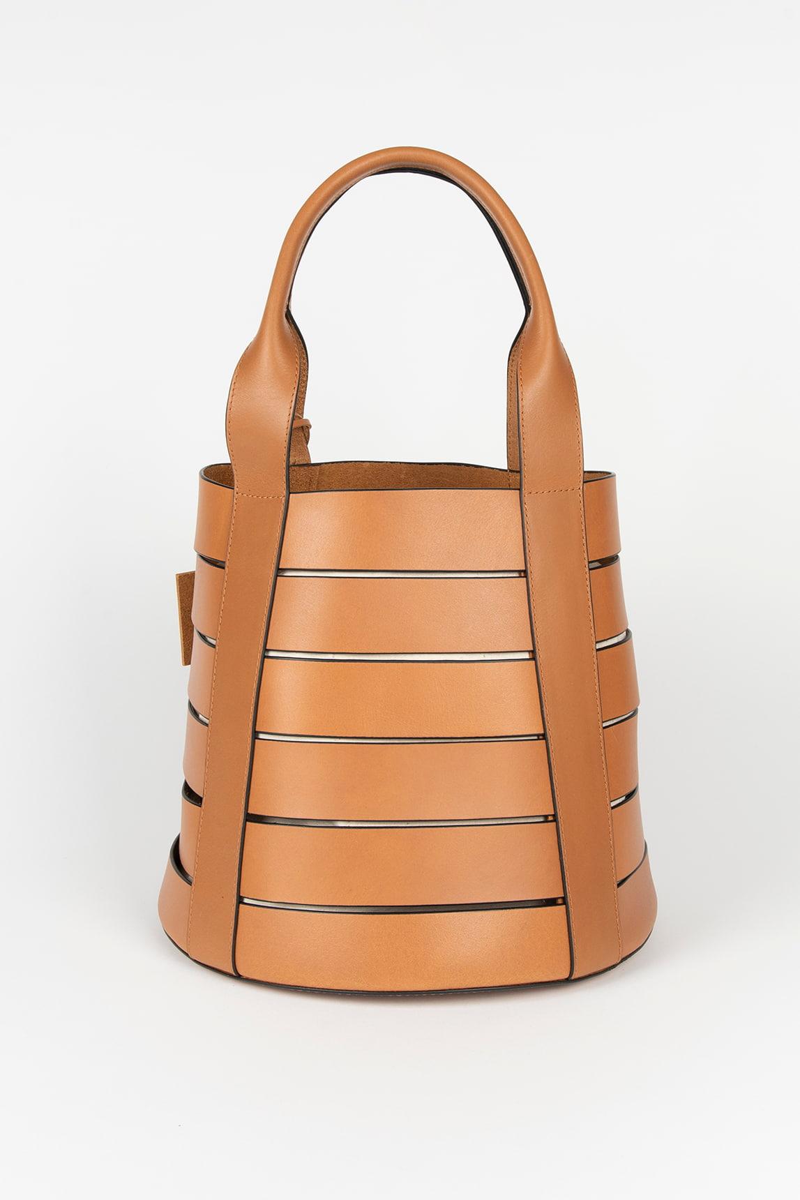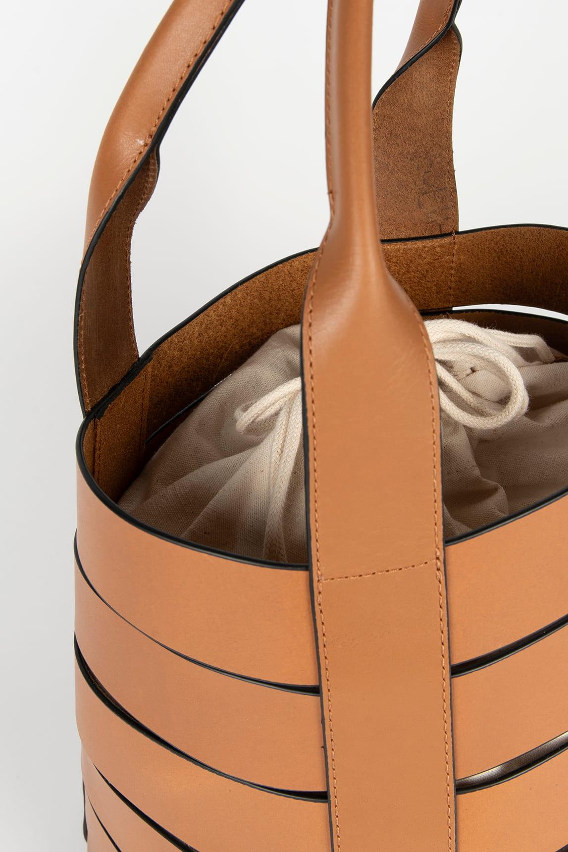 Bolso de piel en tono cuero, un color cálido y luminoso que realza el acabado natural del cuero y aporta personalidad a cualquier estilismo. Su diseño tipo bucket estructurado con bandas horizontales crea un efecto arquitectónico moderno y muy reconocible.
