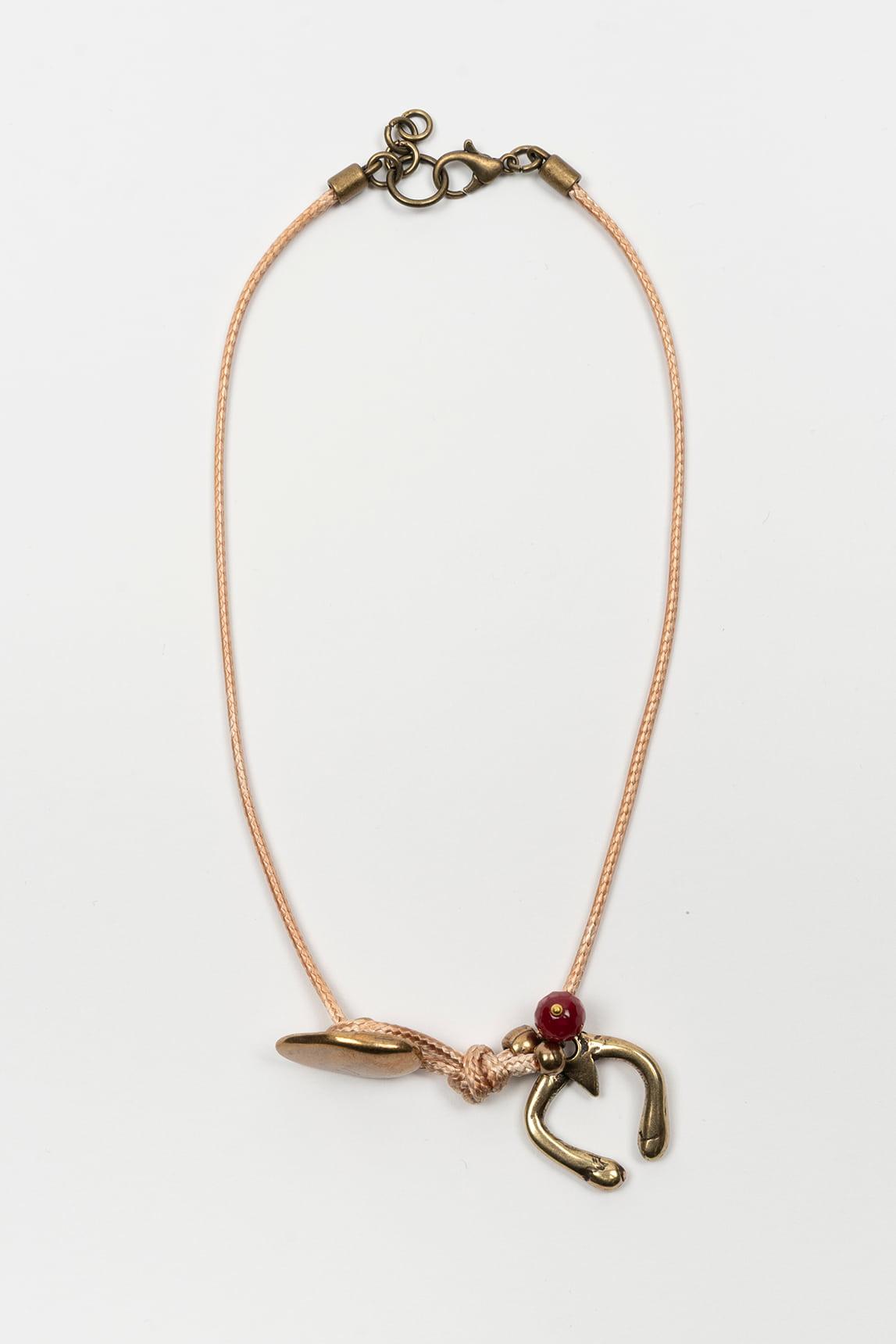 La gargantilla Nerelia en acabado latón combina delicadeza y carácter en un diseño fino que incluye dos piezas de zamak —un botón y una herradura bañados en latón— junto a una piedra ágata. Su estructura ligera sostiene una composición equilibrada de elementos que aportan movimiento y personalidad.