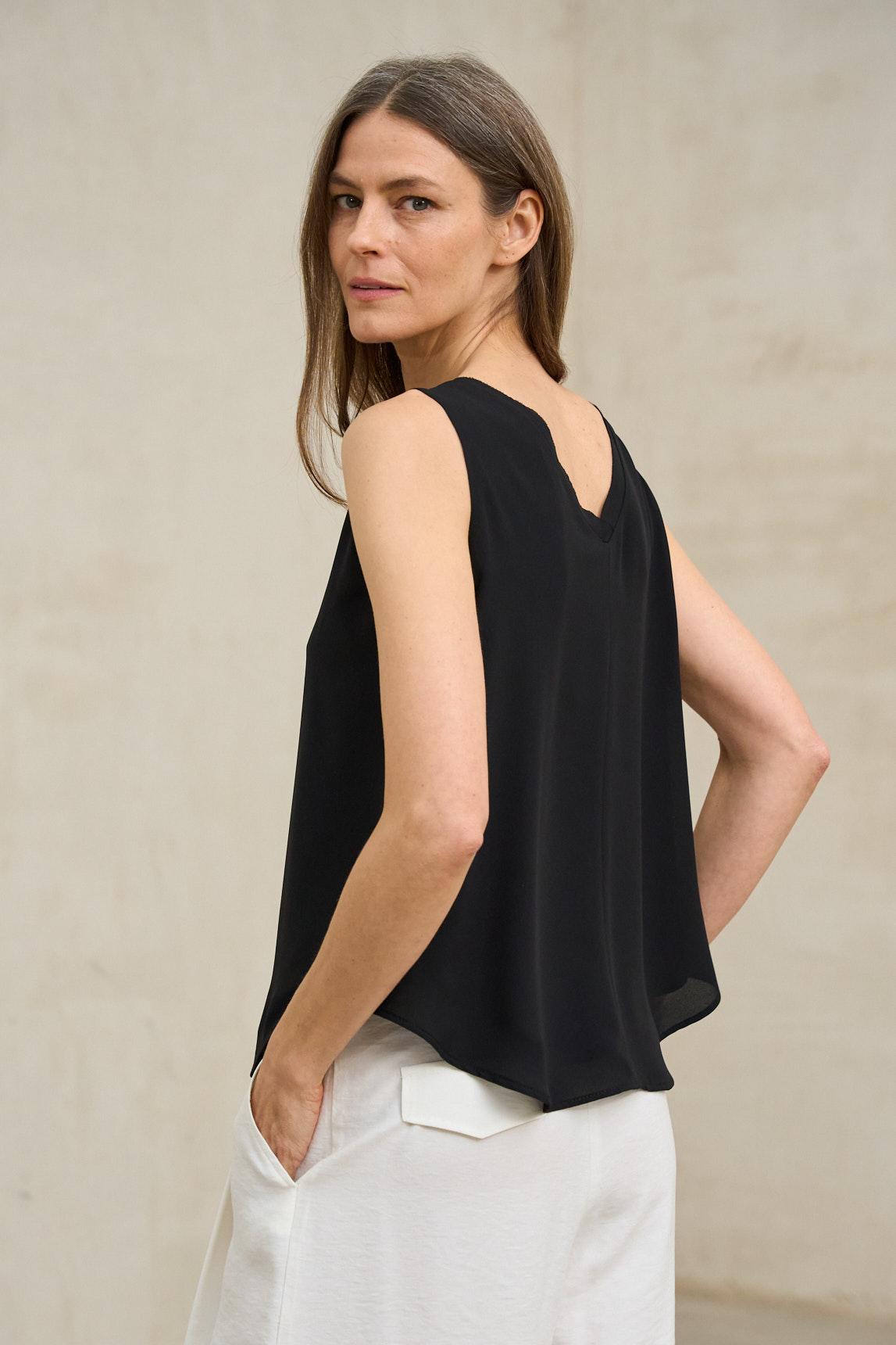 Este top sin mangas se caracteriza por su silueta amplia y su escote en pico pronunciado tanto en el delantero como en la espalda, generando una línea limpia y favorecedora. El tejido presenta una superficie lisa con caída fluida que aporta movimiento y ligereza visual. El bajo ligeramente redondeado suaviza la estructura general, mientras que el corte suelto permite un ajuste cómodo y natural.