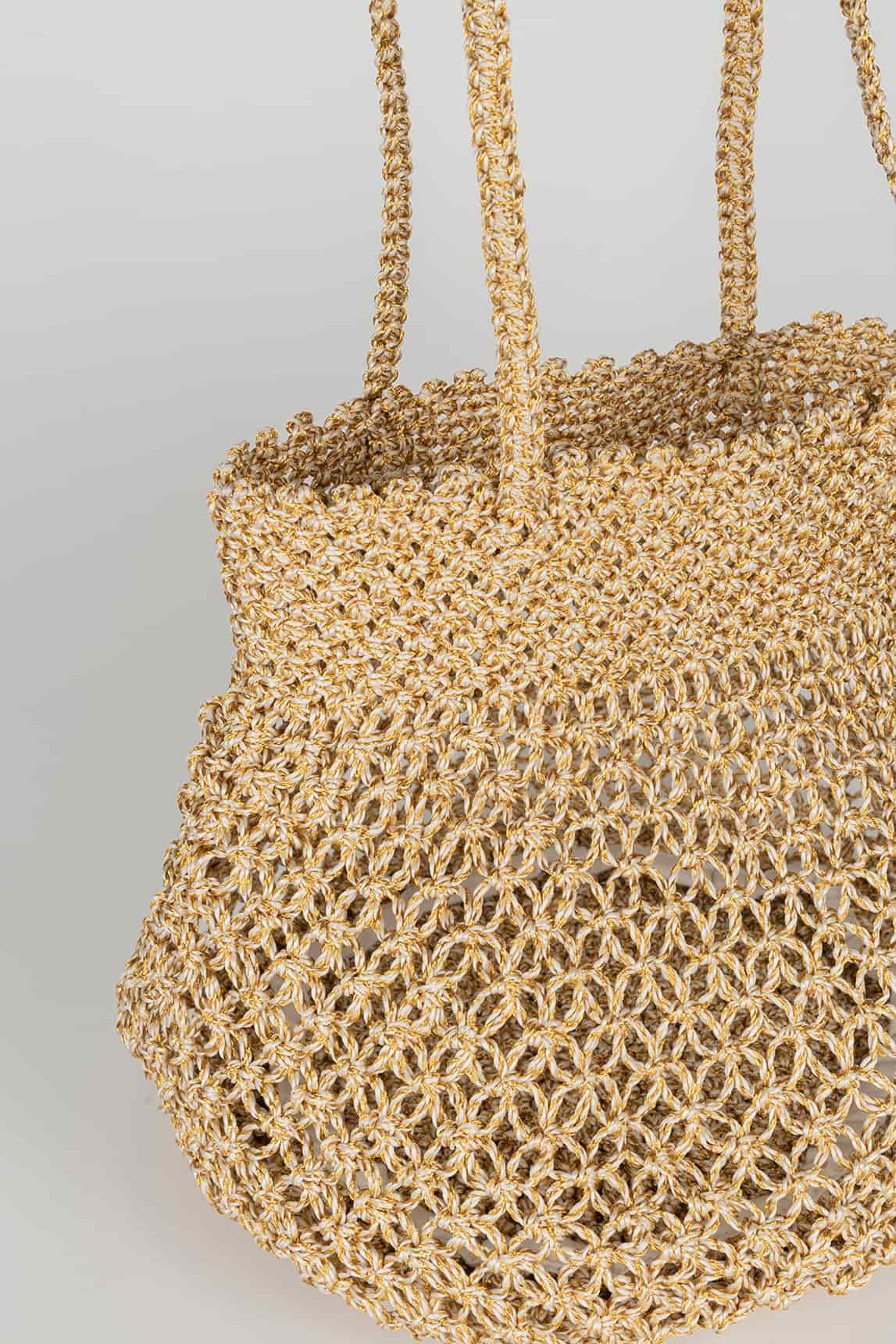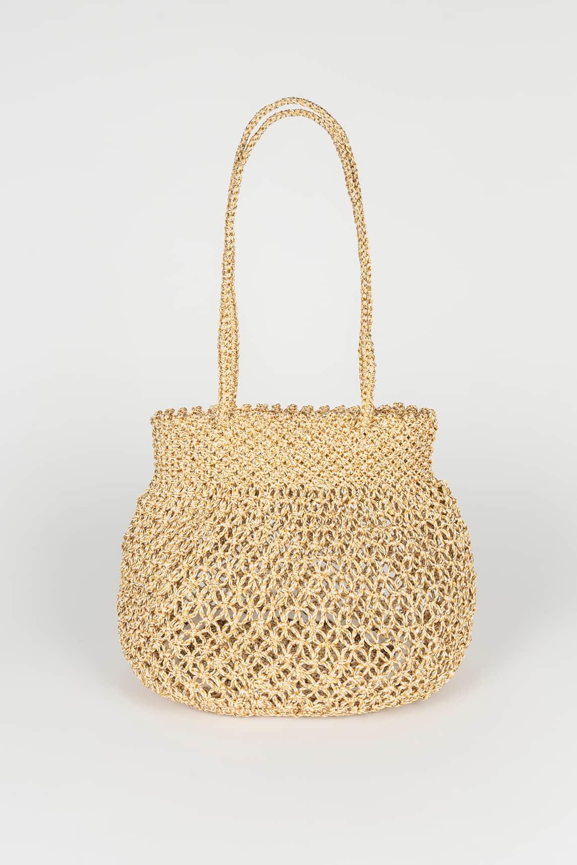El tejido trenzado metalizado genera un efecto luminoso delicado y uniforme, aportando ligereza visual y elegancia al conjunto. Su silueta redondeada suaviza el diseño y equilibra el acabado brillante, creando un bolso elegante, femenino y actual. El asa larga integrada permite llevarlo cómodamente al hombro, manteniendo una caída ligera y natural.