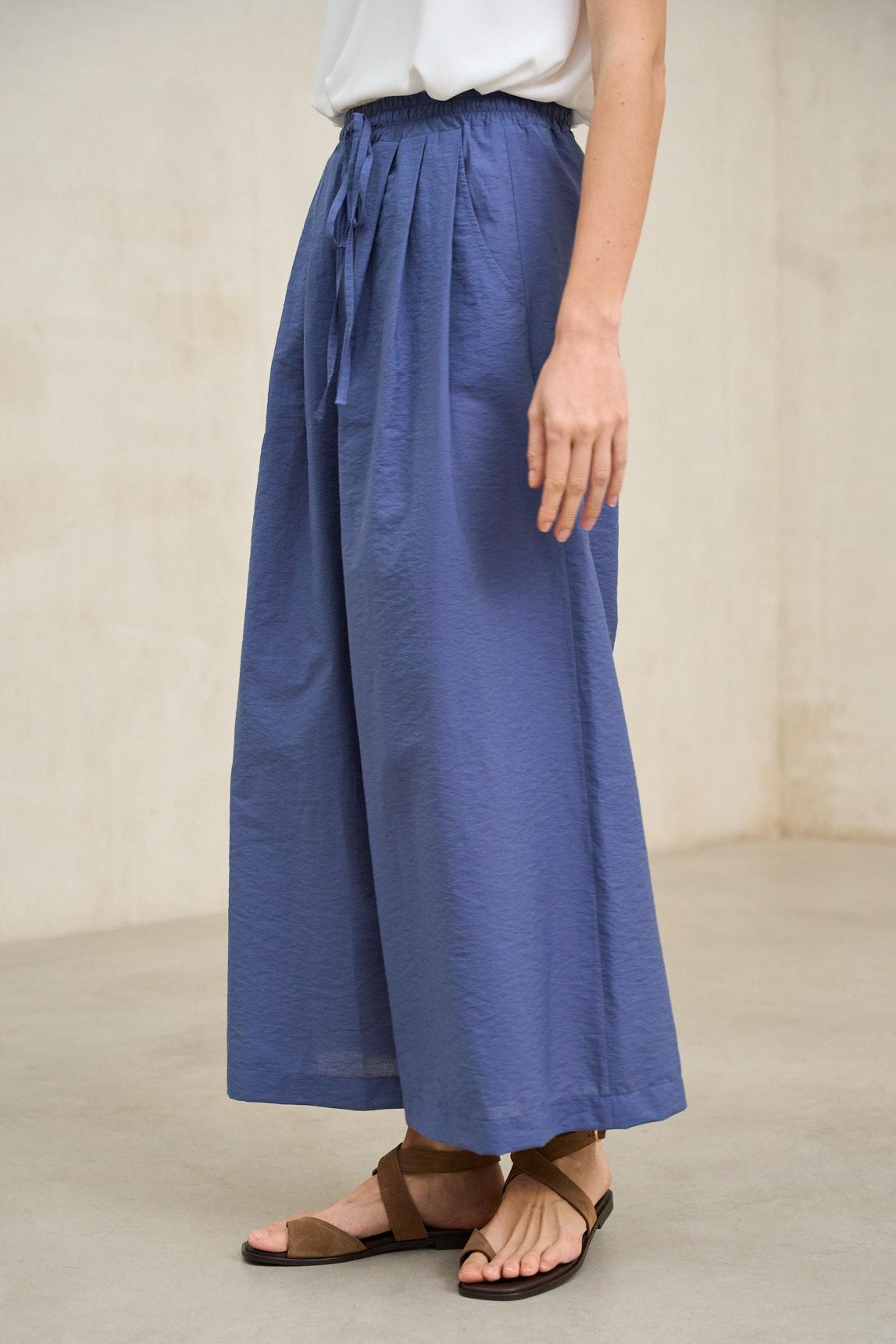 Pantalón de mujer confeccionado en tejido ligero con textura arrugada de aspecto natural, suave al tacto y con caída fluida. Presenta cintura elástica con cordón ajustable que permite un ajuste cómodo y adaptable. Incorpora bolsillos laterales funcionales y pernera recta amplia que aporta movimiento y una silueta relajada. El Pantalón Drift azul oscuro aporta un aire fresco y contemporáneo al modelo. Su tonalidad profunda pero versátil funciona como alternativa al neutro clásico, combinando fácilmente con blanco roto, crudo, arena o incluso tonos tierra para crear contraste equilibrado. Es una prenda pensada para estilismos relajados de primavera y verano, donde confort y estética natural conviven con elegancia sencilla. Ideal para el día a día, viajes o planes informales, mantiene el carácter artesanal del modelo Drift con un matiz más definido y actual. Nos esforzamos por mostrar los colores de la forma más fiel posible, pero pueden variar ligeramente respecto a la realidad.