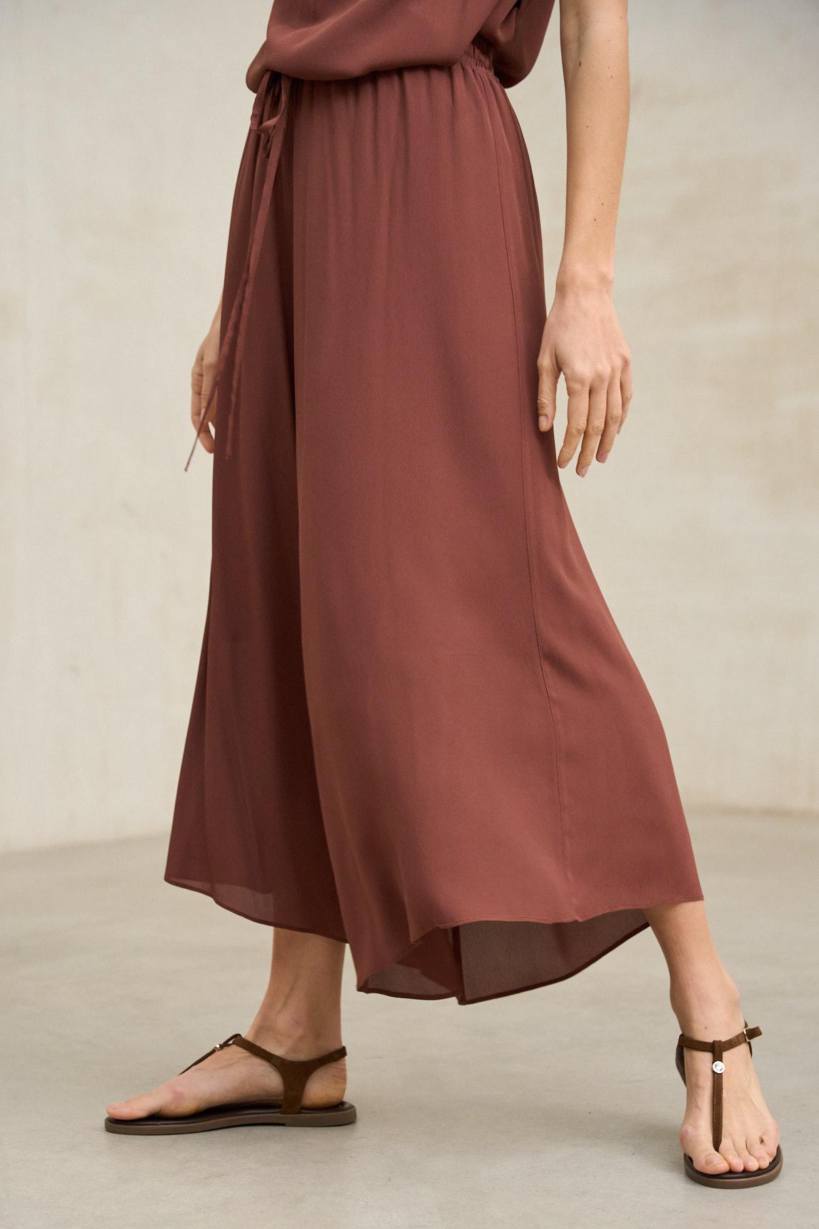 La Falda Nareia en color terracota aporta calidez y sofisticación al look. Su tono tierra profundo resulta ideal para combinar con blancos rotos, crudos y tonos arena, pero alcanza su máxima expresión cuando se lleva junto a la Blusa Támara, creando un conjunto coordinado equilibrado y armónico. La fluidez del tejido suaviza la intensidad del color, logrando una prenda femenina, versátil y atemporal.