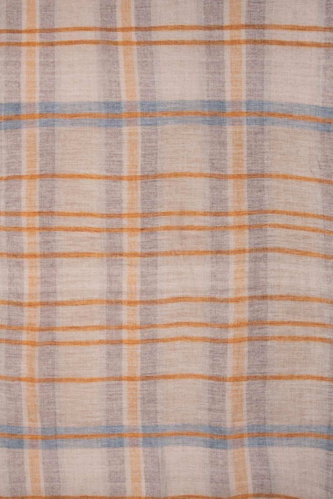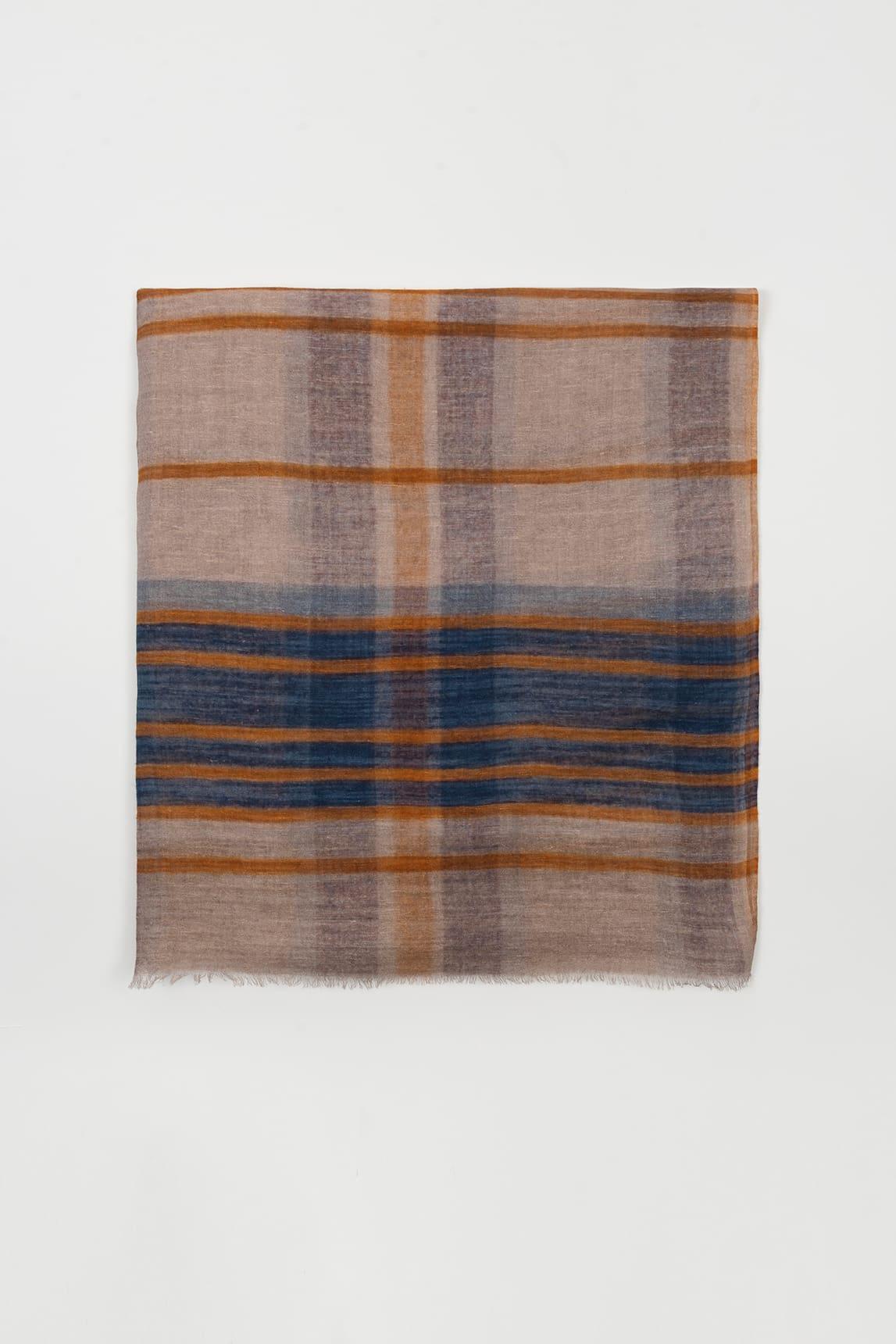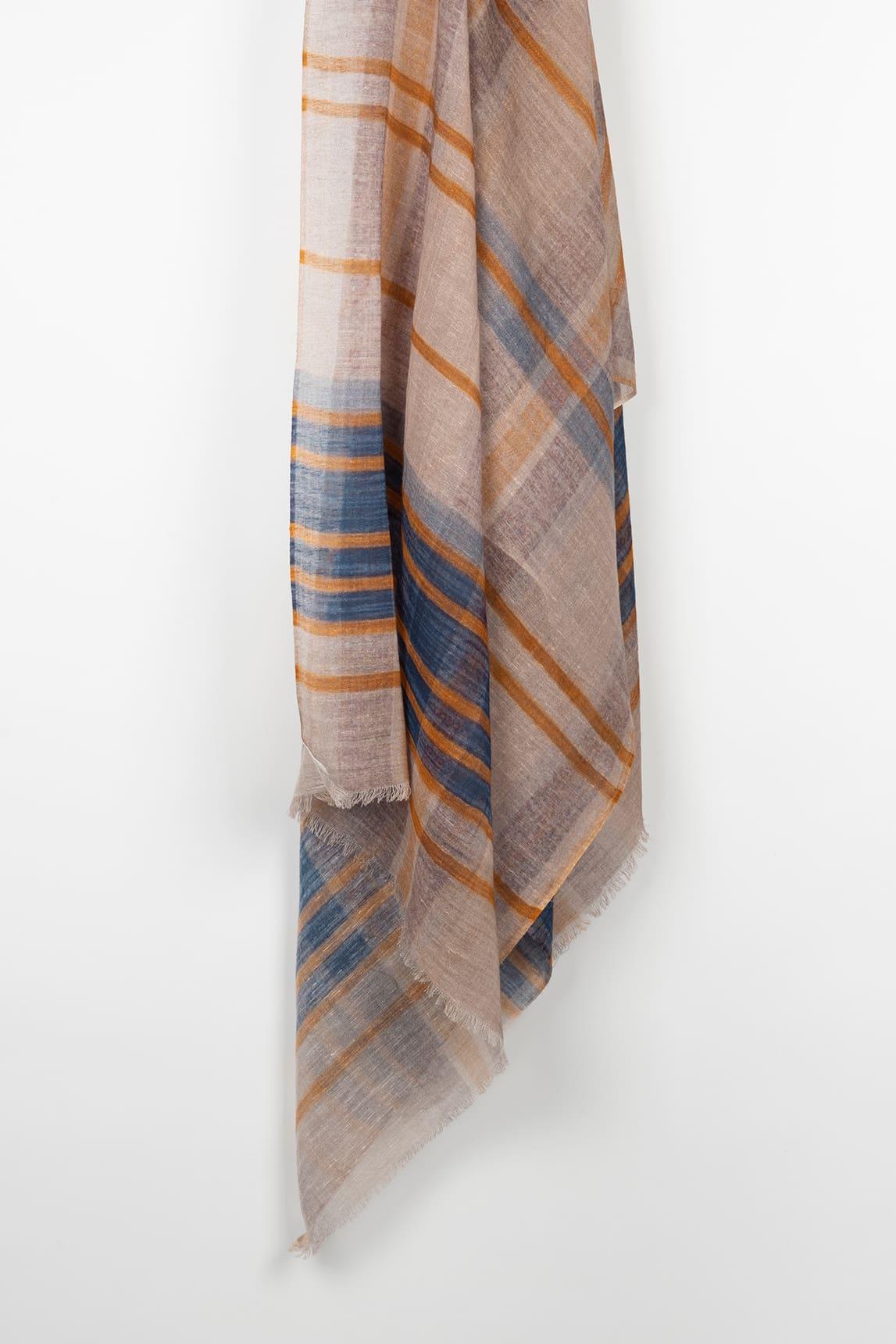 El fular Lumeria Rayas combina un elegante patrón de líneas cruzadas y franjas en tonos arena, azul grisáceo y matices cálidos mostaza. El diseño alterna zonas más suaves con cuadros sutiles, creando un efecto equilibrado entre lo clásico y lo contemporáneo.