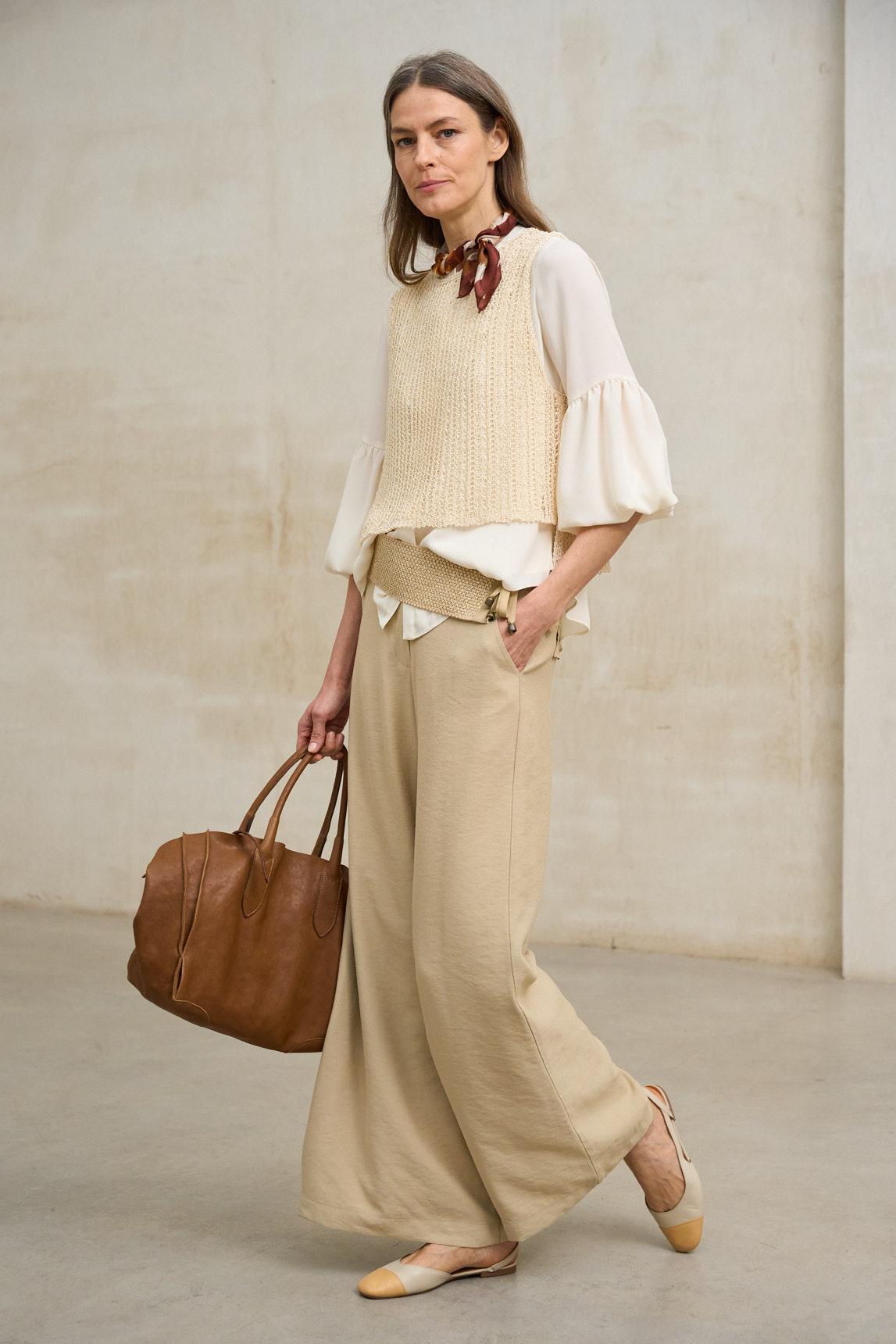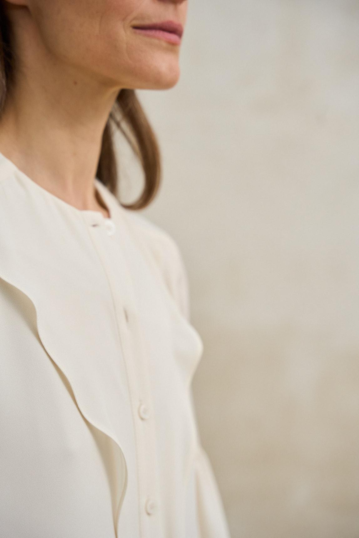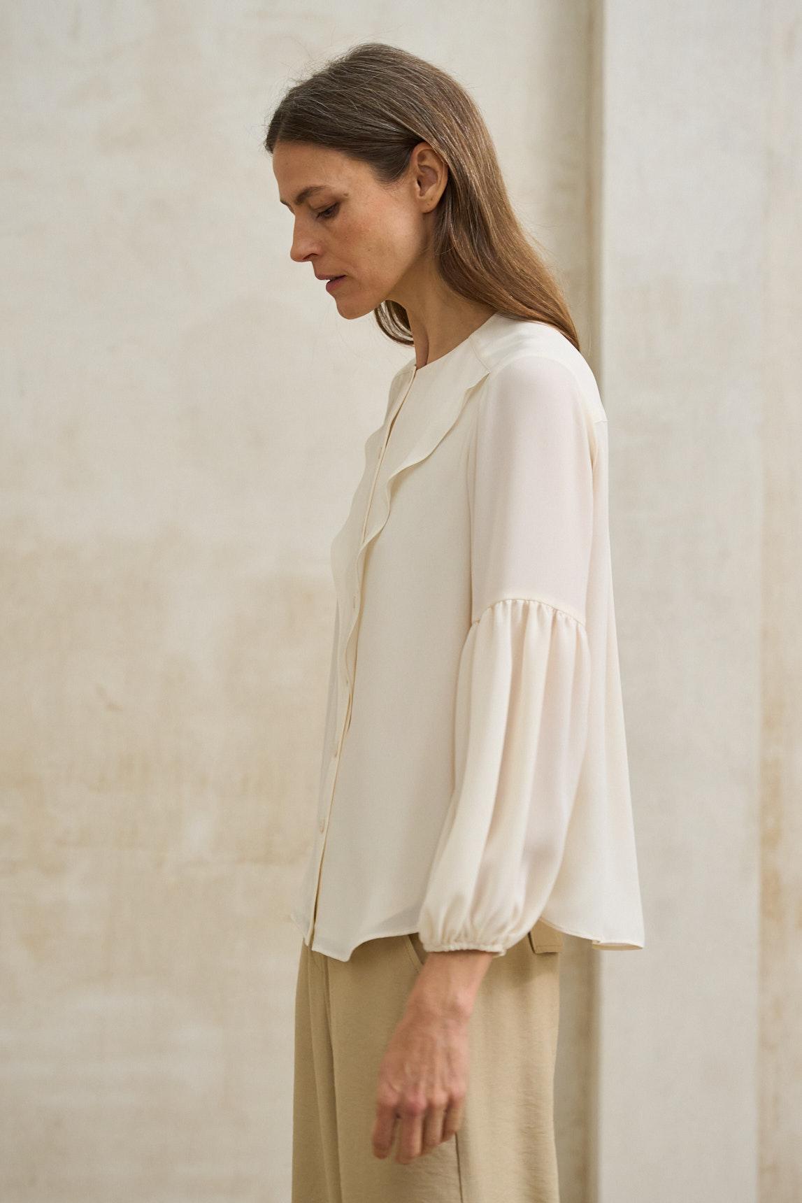La blusa Mireya crudo roto es una prenda ligera y delicada, confeccionada en tejido semitransparente que aporta movimiento y sutileza al diseño. Su silueta fluida y su caída suave crean un efecto elegante y femenino, ideal para estilismos luminosos y sofisticados. Presenta escote redondeado y manga larga ligeramente abullonada con puño elástico, que equilibra volumen y ligereza. El acabado translúcido del tejido añade profundidad visual y permite jugar con superposiciones, recomendando combinarla con una camiseta o top interior para mayor cobertura. El tono blanco roto refuerza su versatilidad y la convierte en una pieza esencial dentro de un armario neutro. Perfecta para combinar con pantalones fluidos, faldas midi o denim claro, tanto en looks de diario como en estilismos más cuidados. Nos esforzamos por mostrar los colores de la forma más fiel posible, pero pueden variar ligeramente respecto a la realidad.
