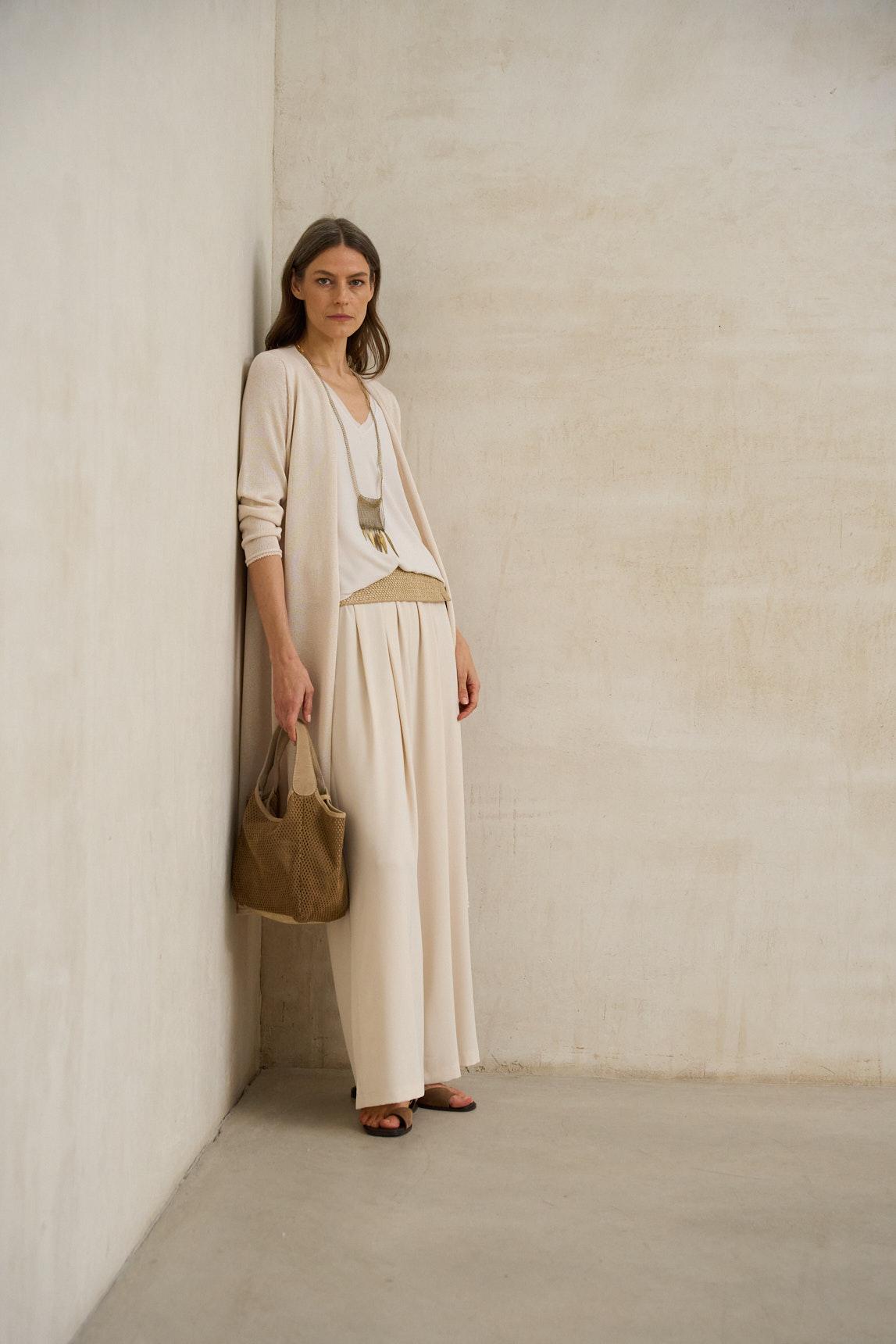 La chaqueta de punto Avelin crudo es una prenda larga y fluida diseñada para aportar ligereza y sofisticación a los estilismos de entretiempo. Su silueta abierta, sin cierre, cae con naturalidad desde los hombros, creando una línea vertical que estiliza y alarga visualmente la figura. Confeccionada en tejido de punto suave y ligero, presenta manga larga y un bajo ligeramente evasé que aporta movimiento al caminar. El tono crudo, luminoso y atemporal, refuerza su versatilidad dentro de una paleta neutra, combinando fácilmente con arena, camel, verde oliva o gris antracita. Ideal para superponer sobre conjuntos monocromáticos, pantalones fluidos o vestidos ligeros, la chaqueta de punto Avelin crudo funciona como capa ligera que estructura el look sin añadir peso. Una pieza elegante y atemporal pensada para acompañar tanto estilismos de día como propuestas más cuidadas. Nos esforzamos por mostrar los colores de la forma más fiel posible, pero pueden variar ligeramente respecto a la realidad.