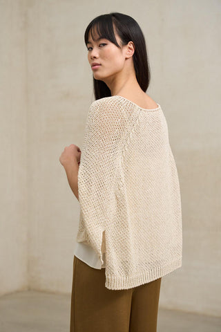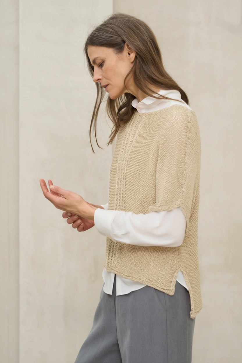 El jersey Calira beige es una prenda ligera confeccionada en punto fino con textura sutil y un acabado de efecto semitransparente que aporta delicadeza y ligereza visual. Su diseño de manga al codo equilibra proporciones y le da un carácter contemporáneo, ideal para entretiempo o días templados. Presenta escote redondo amplio y silueta recta con caída suave que no marca la figura, favoreciendo un ajuste relajado y elegante. La manga al codo estiliza el brazo y aporta mayor estructura que una manga larga tradicional, convirtiéndolo en una pieza versátil tanto para estilismos casuales como para looks más depurados. El tono beige refuerza su luminosidad y lo convierte en un básico sofisticado dentro del armario neutro. Combina especialmente bien con pantalones arena, beige, topo o verde oliva. Al tratarse de un tejido de trama ligera, recomendamos llevarlo con un top básico debajo (no incluido) para un acabado más armónico. Una pieza femenina, cómoda y fácil de integrar en el armario, perfecta para aportar textura y suavidad sin perder frescura. Nos esforzamos por mostrar los colores de la forma más fiel posible, pero pueden variar ligeramente respecto a la realidad.