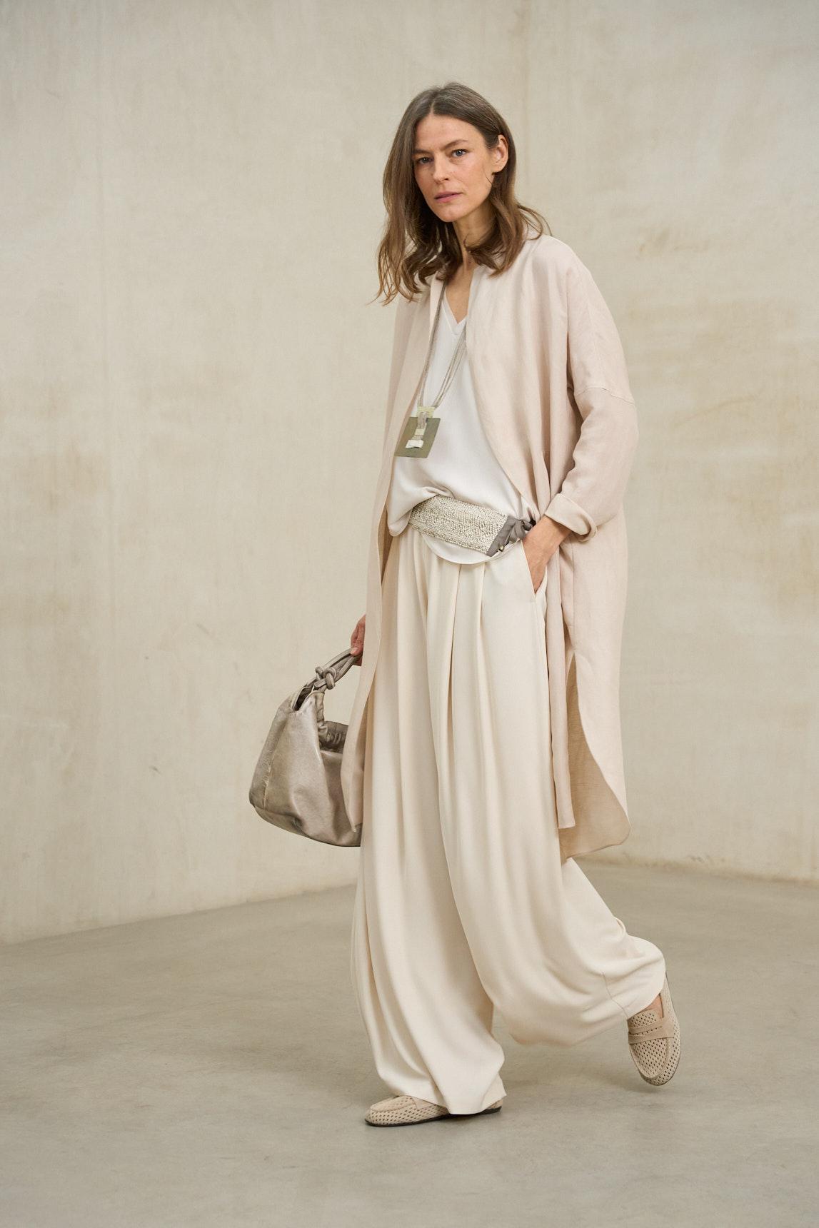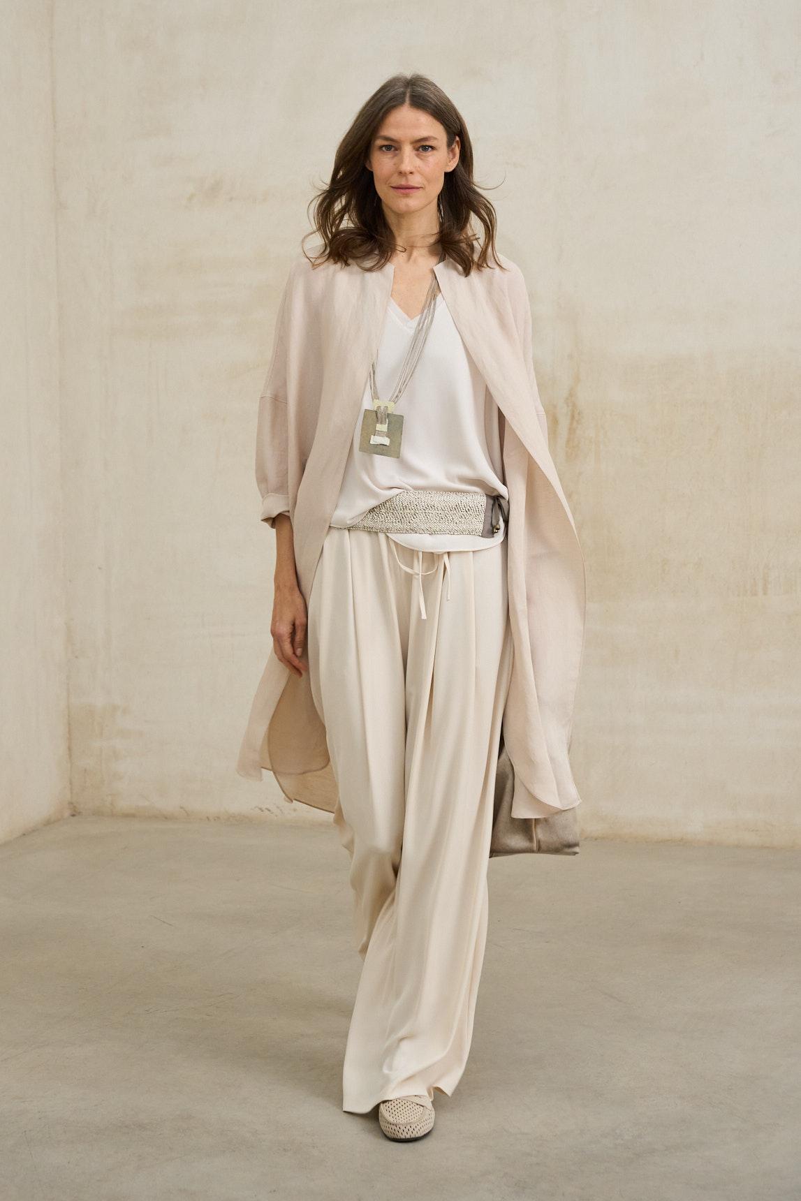El tono crudo, delicado y luminoso, combina con facilidad en estilismos monocromáticos o en propuestas para bodas, comuniones y celebraciones especiales. Es una prenda refinada que equilibra elegancia y comodidad.