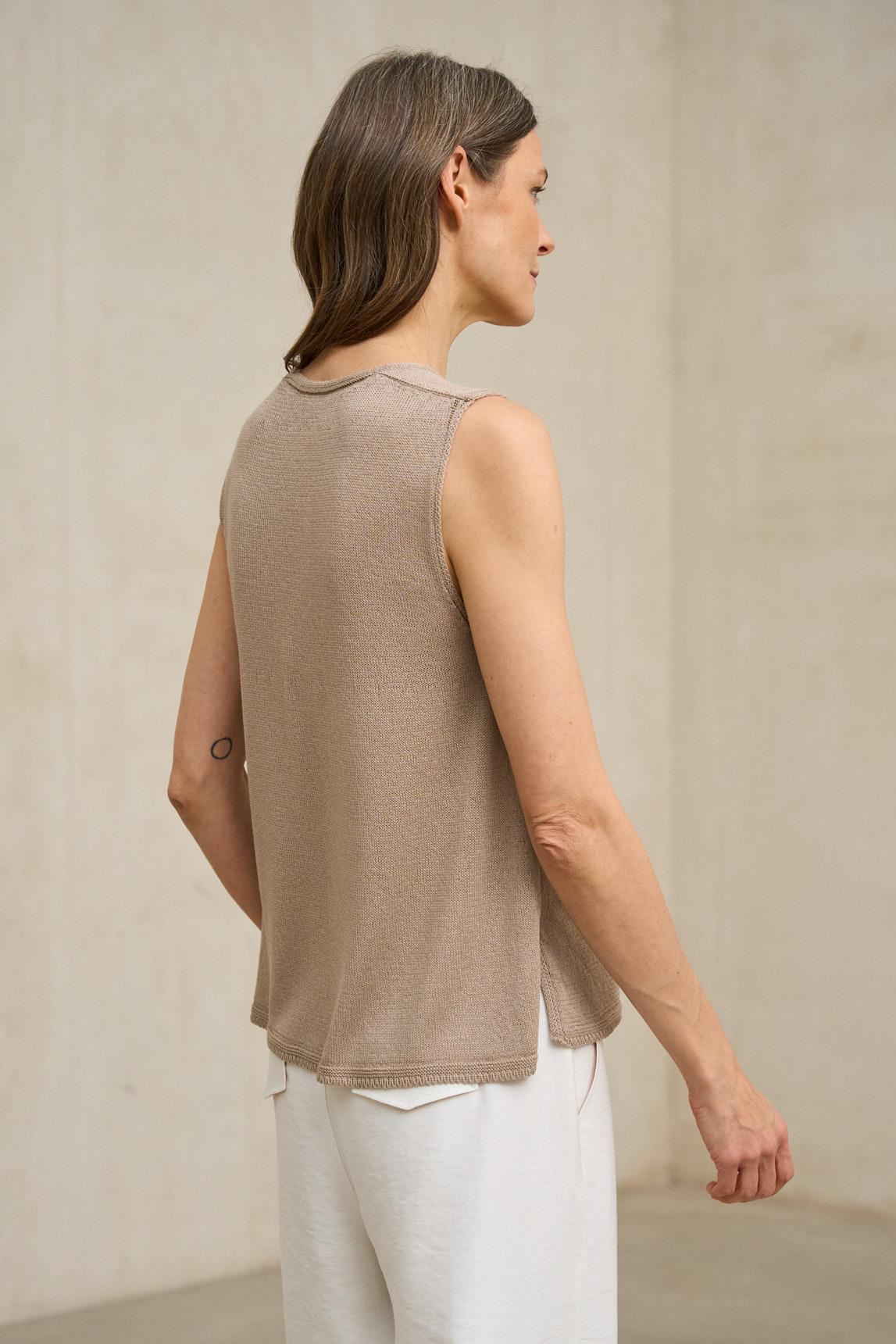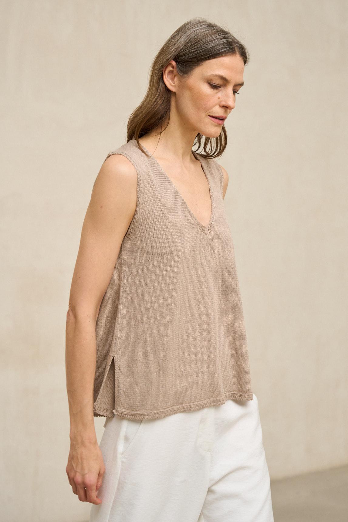 El top de punto Virel arena es una prenda minimalista de líneas limpias que destaca por su silueta depurada y su caída natural. Confeccionado en tejido de punto ligero y suave, presenta escote en pico y diseño sin mangas que estiliza el torso con discreción.
