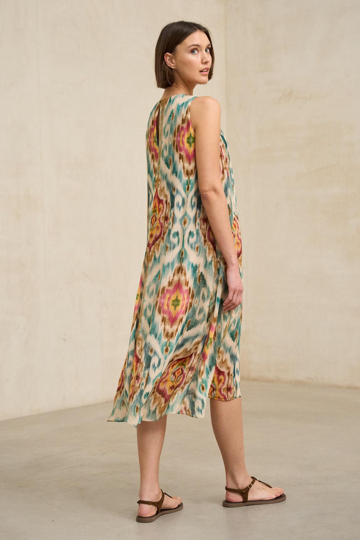 El vestido Naïra estampado ikat mantiene la silueta fluida y el diseño minimalista que definen el modelo. Con escote en pico y corte sin mangas, presenta una estructura amplia que cae con naturalidad, creando movimiento y ligereza al caminar.