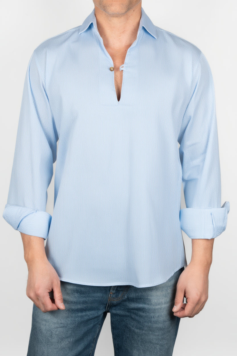 Camisa de hombre de manga larga en tono celeste, con una silueta recta y diseño limpio de inspiración relajada. El modelo incorpora cuello abierto, abertura frontal corta con botones y puños con botón, construyendo una imagen equilibrada entre comodidad y estilo. El acabado visual ligero y la textura sutil del tejido refuerzan su aspecto natural, aportando profundidad sin recargar la prenda y favoreciendo una caída fluida.