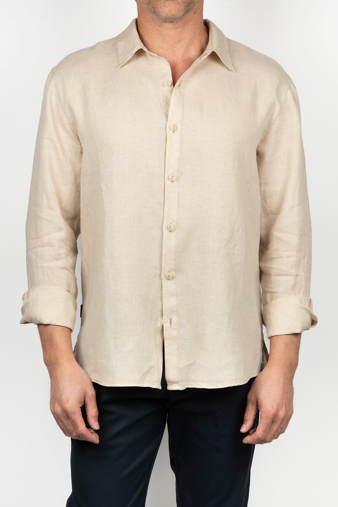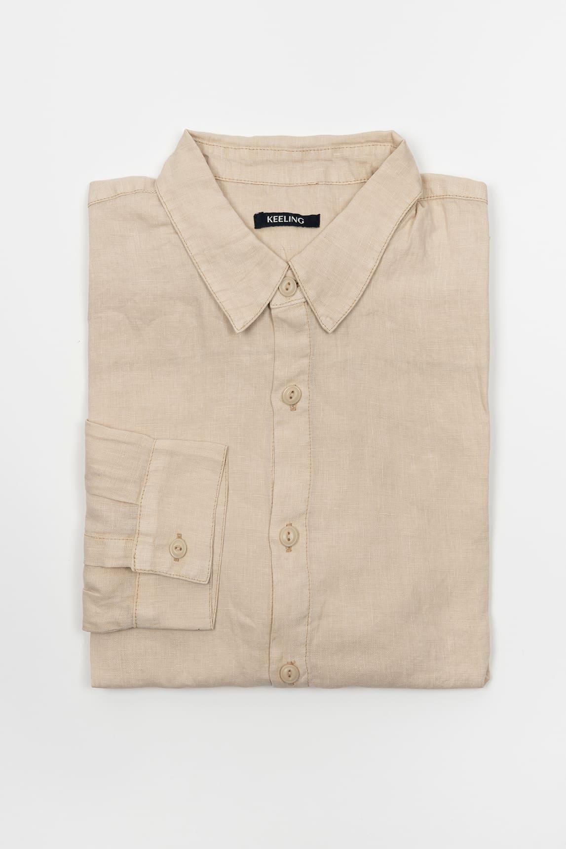 Camisa de hombre de manga larga en tono beige, con silueta recta y una construcción de líneas limpias. Presenta cuello clásico, cierre frontal de botones al tono y puño abotonado, con una superficie de aspecto suave y un acabado lavado que aporta profundidad cromática sin restar sencillez al diseño. La estructura se percibe ligera, favoreciendo una caída natural y una imagen relajada pero bien ordenada.