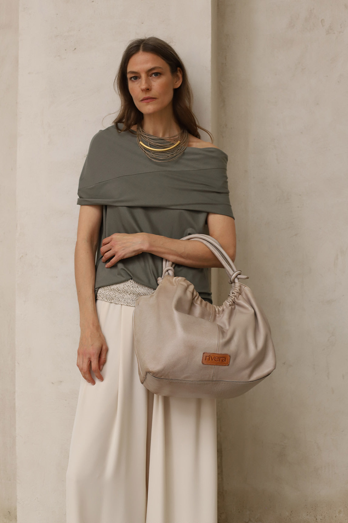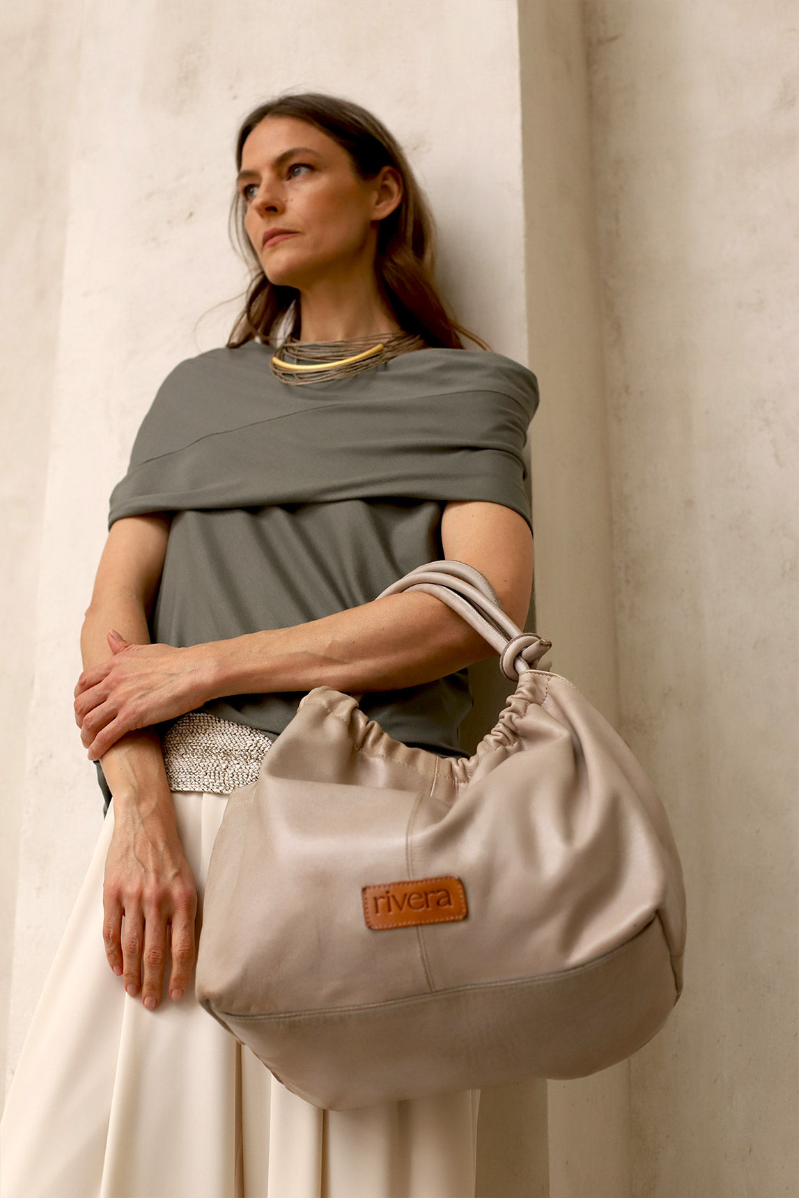 - Bolso de piel natural en tono beige con acabado suave y ligeramente envejecido.