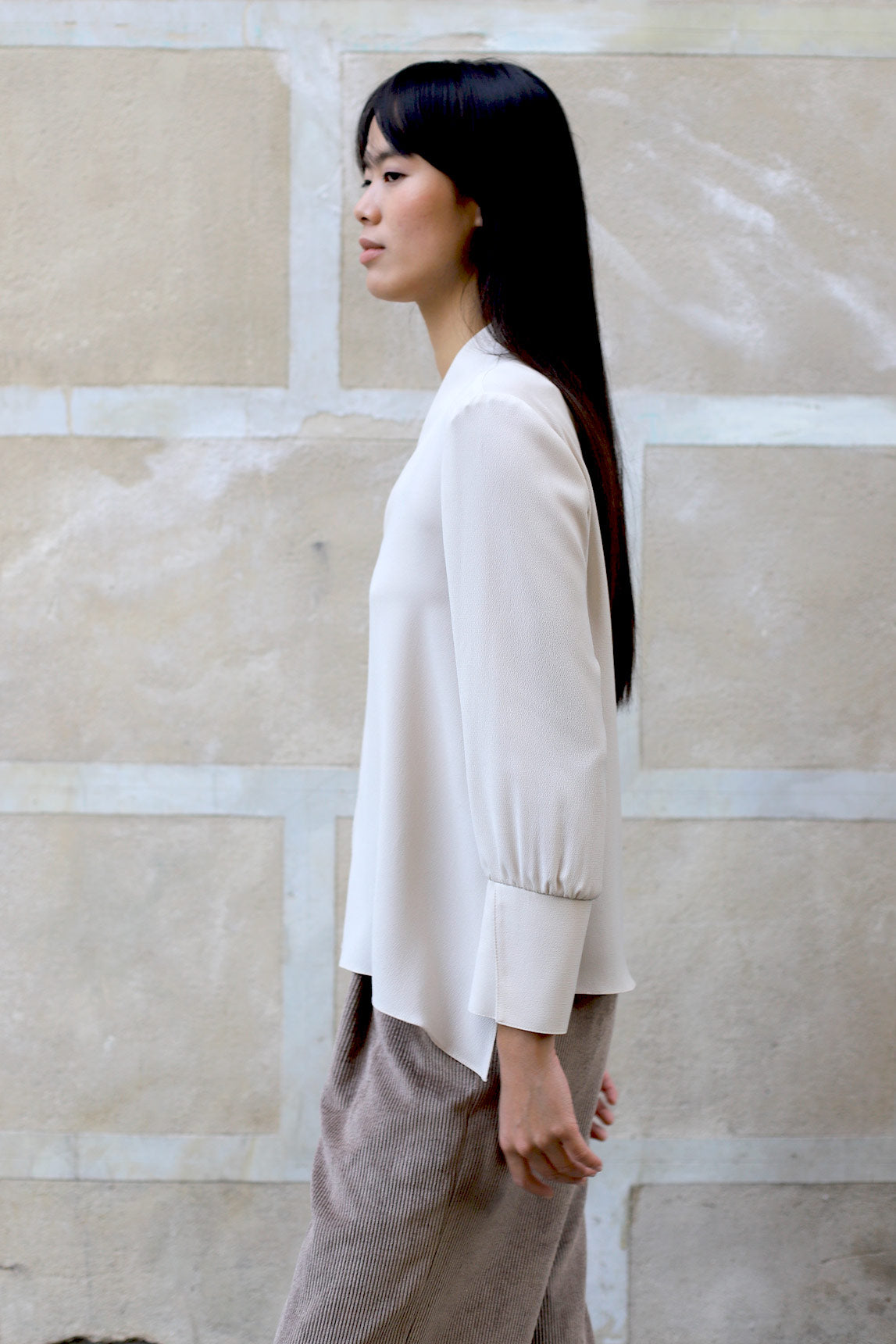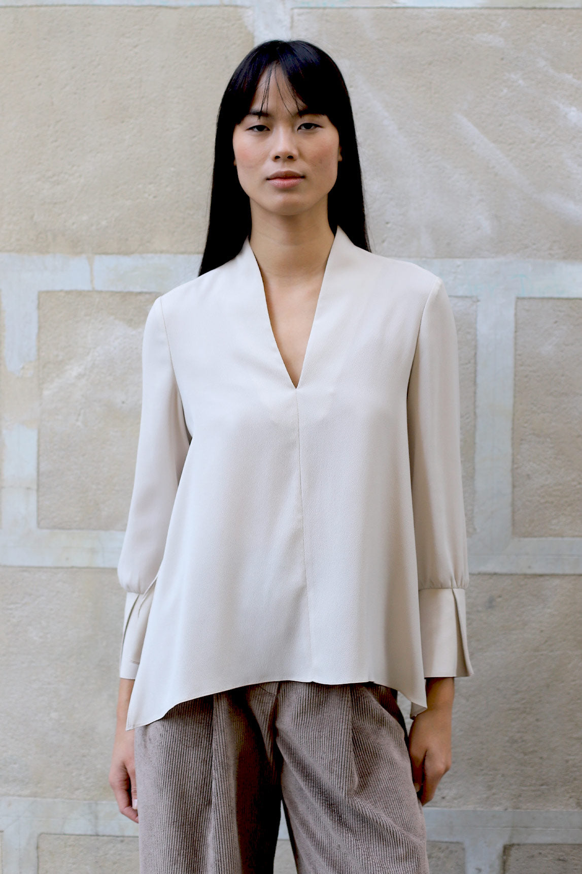 - Escote pico con apertura en V y bajo ligeramente más largo en la espalda.