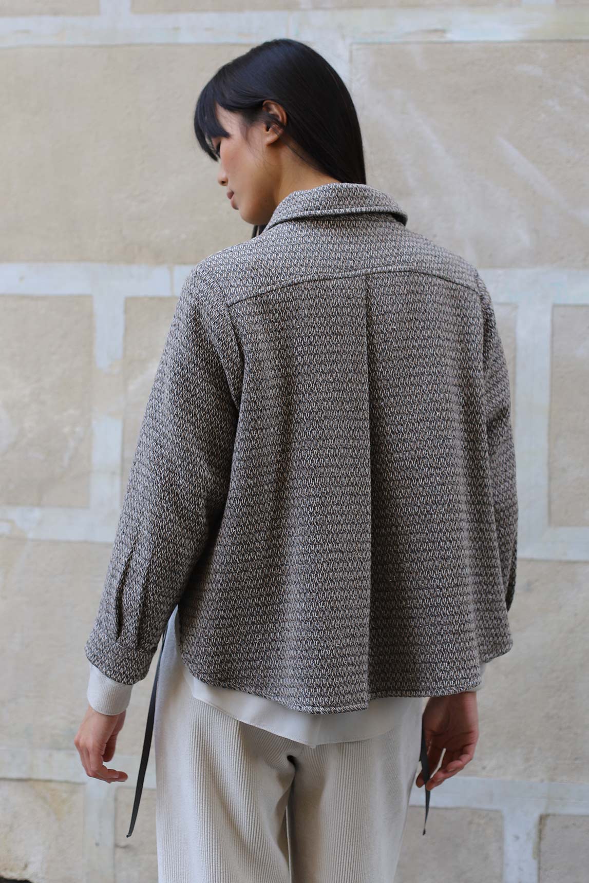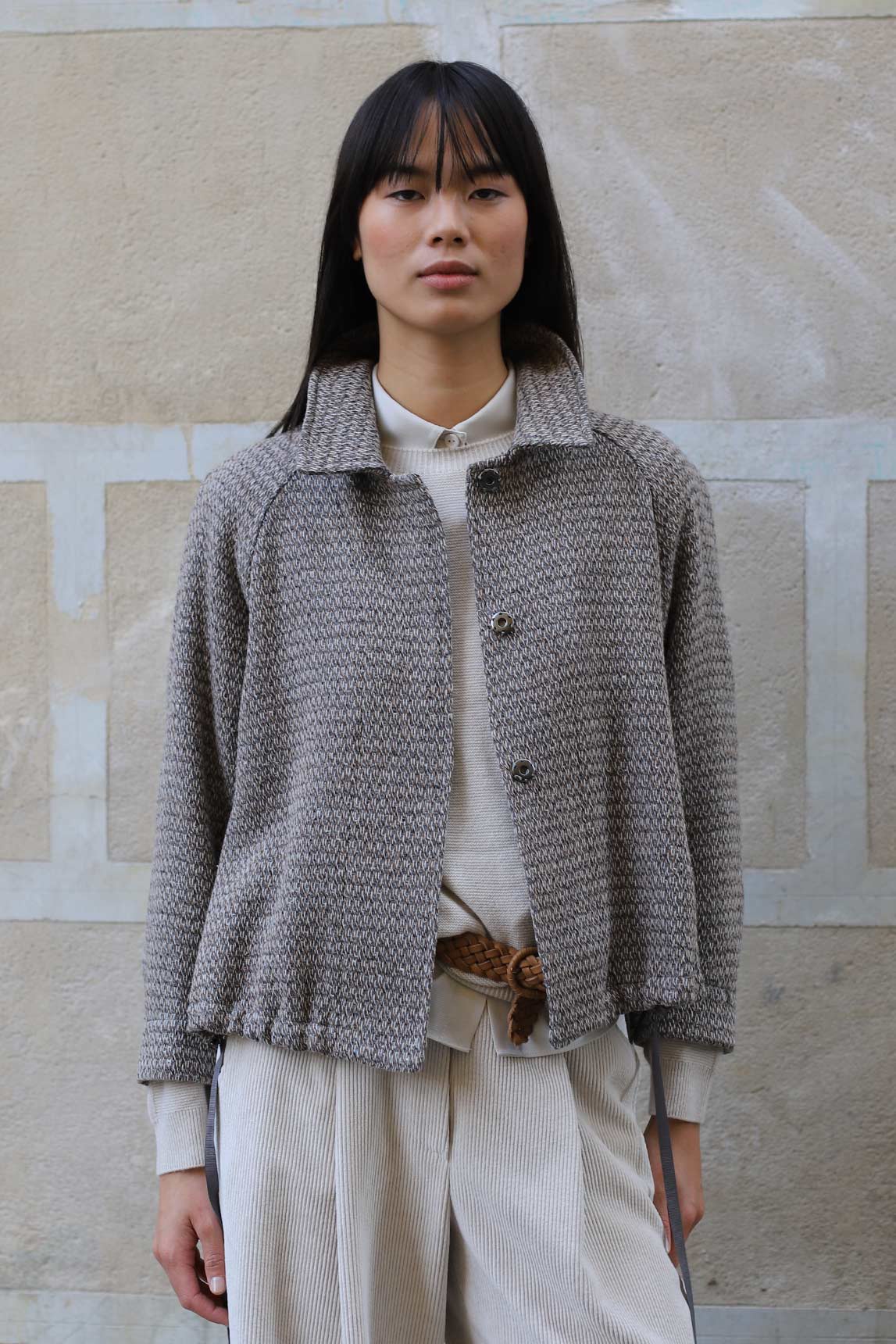 La cazadora Novara es la prenda ligera que completa cualquier look con un aire sofisticado y práctico. Su tejido jacquard bicolor aporta textura y profundidad al color, mientras la silueta recta con manga raglán favorece y permite superponer cómodamente camisas o punto fino. El cuello camisero y el cierre de botones rematan un diseño limpio y versátil, ideal para entretiempo con vaqueros, sastre claro o faldas midi.