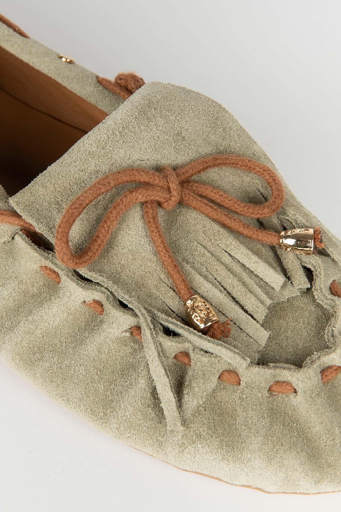 El mocasín Flecco pistacho reinterpreta el clásico mocasín con un diseño relajado y lleno de personalidad. Destaca por su detalle de flecos en el empeine y el lazo decorativo con terminaciones metálicas, elementos que aportan movimiento y un toque artesanal al conjunto.