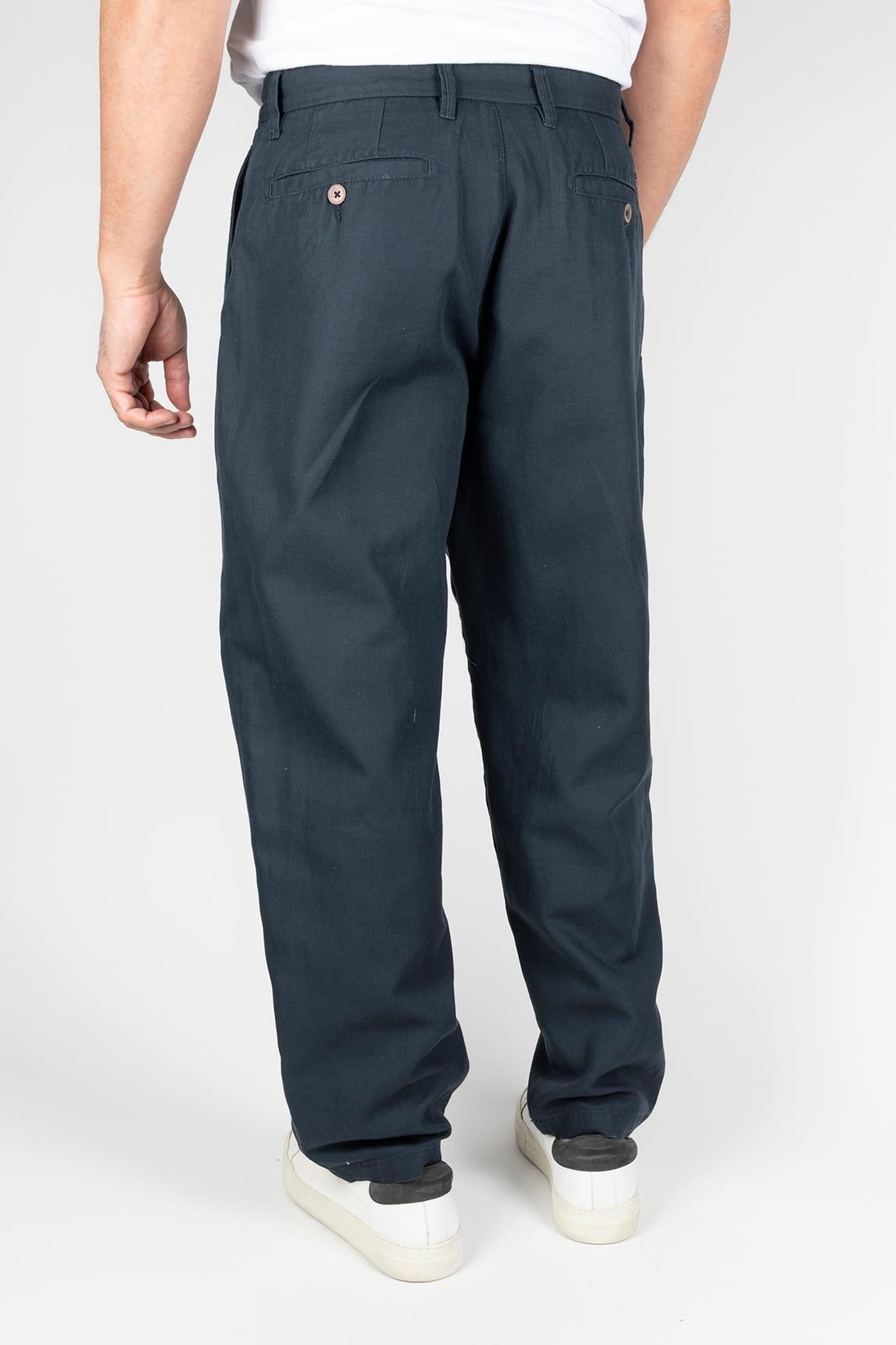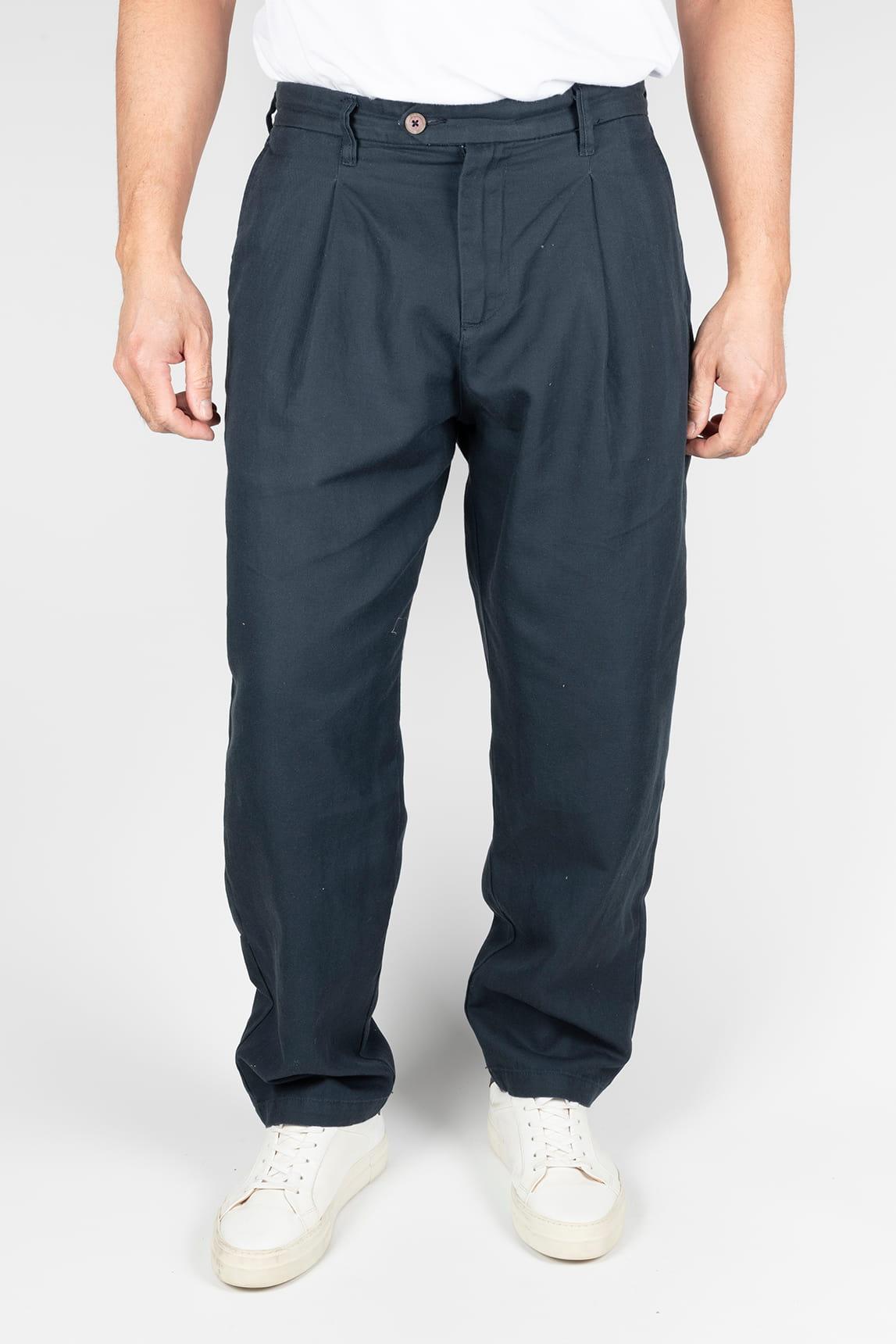 Este pantalón en tono azul marino presenta una silueta estructurada con pernera larga y caída recta que aporta una imagen sólida y equilibrada. El cierre frontal con botón visible y cremallera se combina con trabillas para cinturón, mientras las pinzas delanteras añaden un sutil volumen en la parte superior que define la forma con elegancia. Los bolsillos laterales y el tejido de apariencia ligeramente texturizada refuerzan su estética cuidada, con un acabado uniforme que transmite sobriedad.