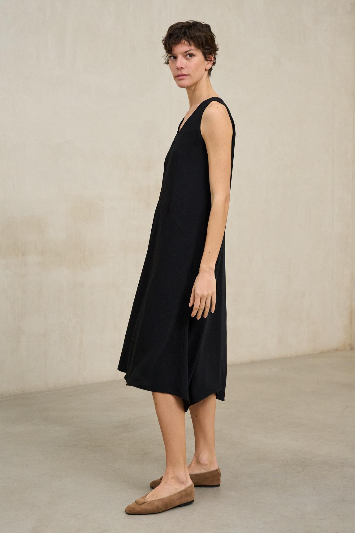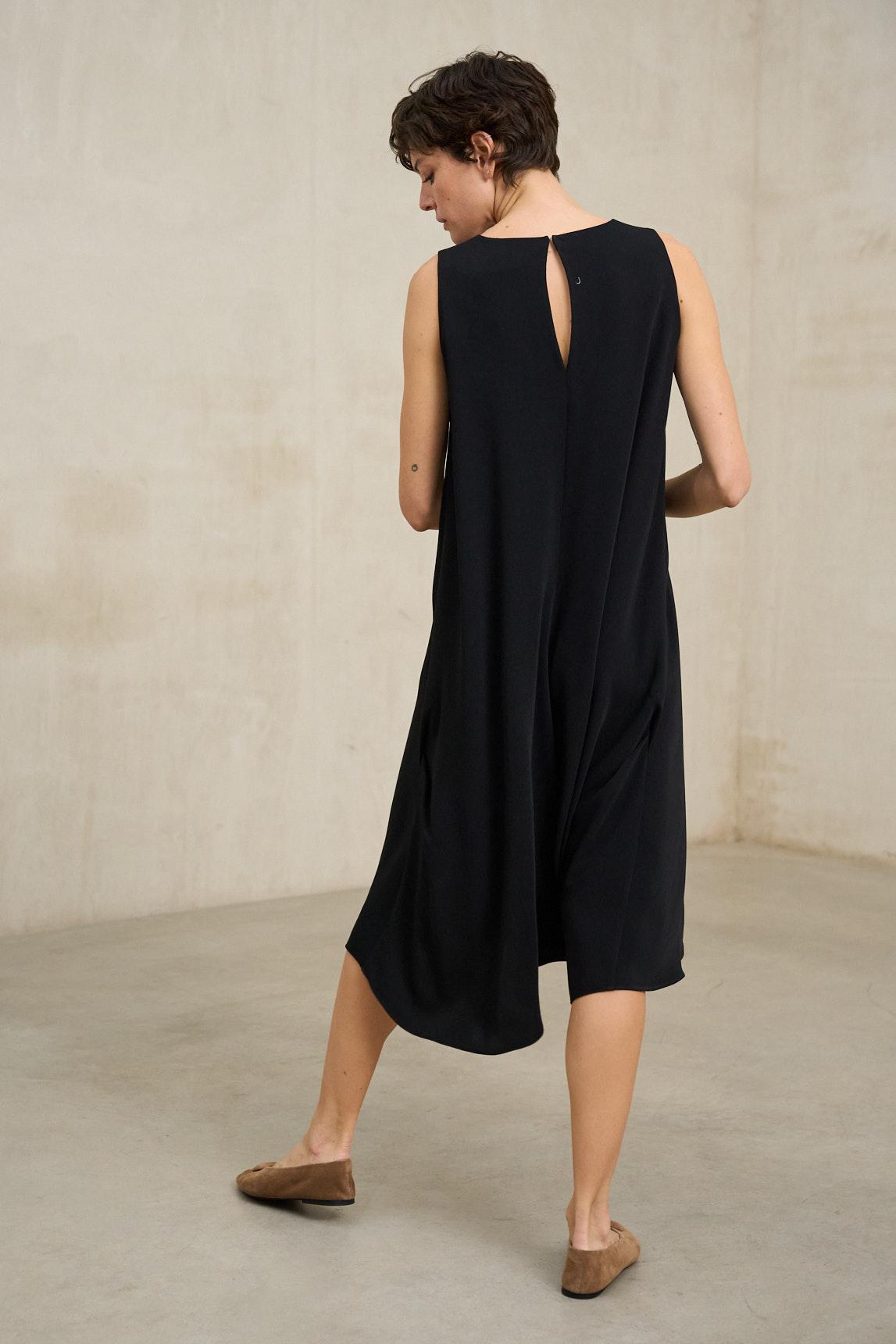 El vestido Naïra negro es una prenda de líneas limpias y silueta fluida que destaca por su caída ligera y su movimiento natural. Confeccionado en tejido suave y con cuerpo sutil, presenta escote en pico y diseño sin mangas que estiliza la figura y aporta un aire contemporáneo y minimalista.