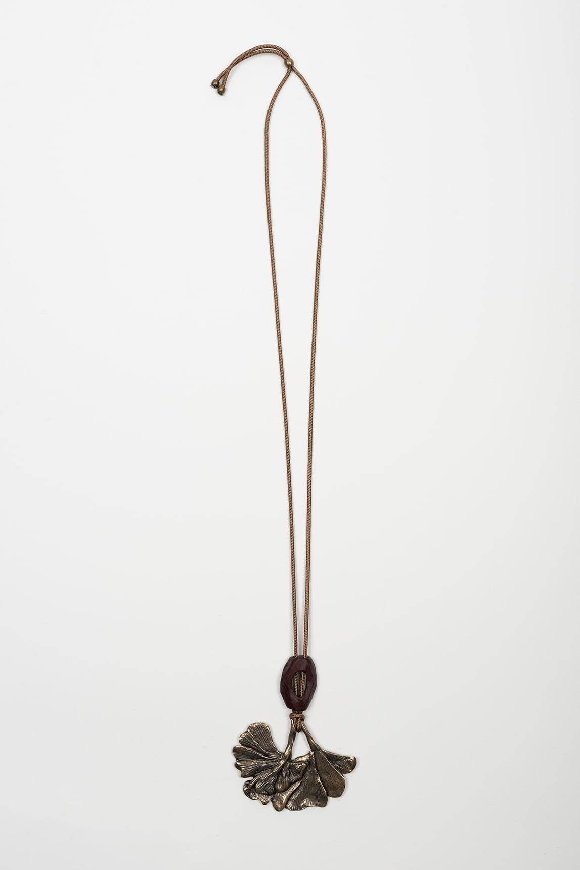 O colar Gineva em latão mantém a silhueta alongada e o pendente de inspiração orgânica que definem o design. A combinação do motivo principal com a peça superior oval cria uma composição equilibrada e distinta.