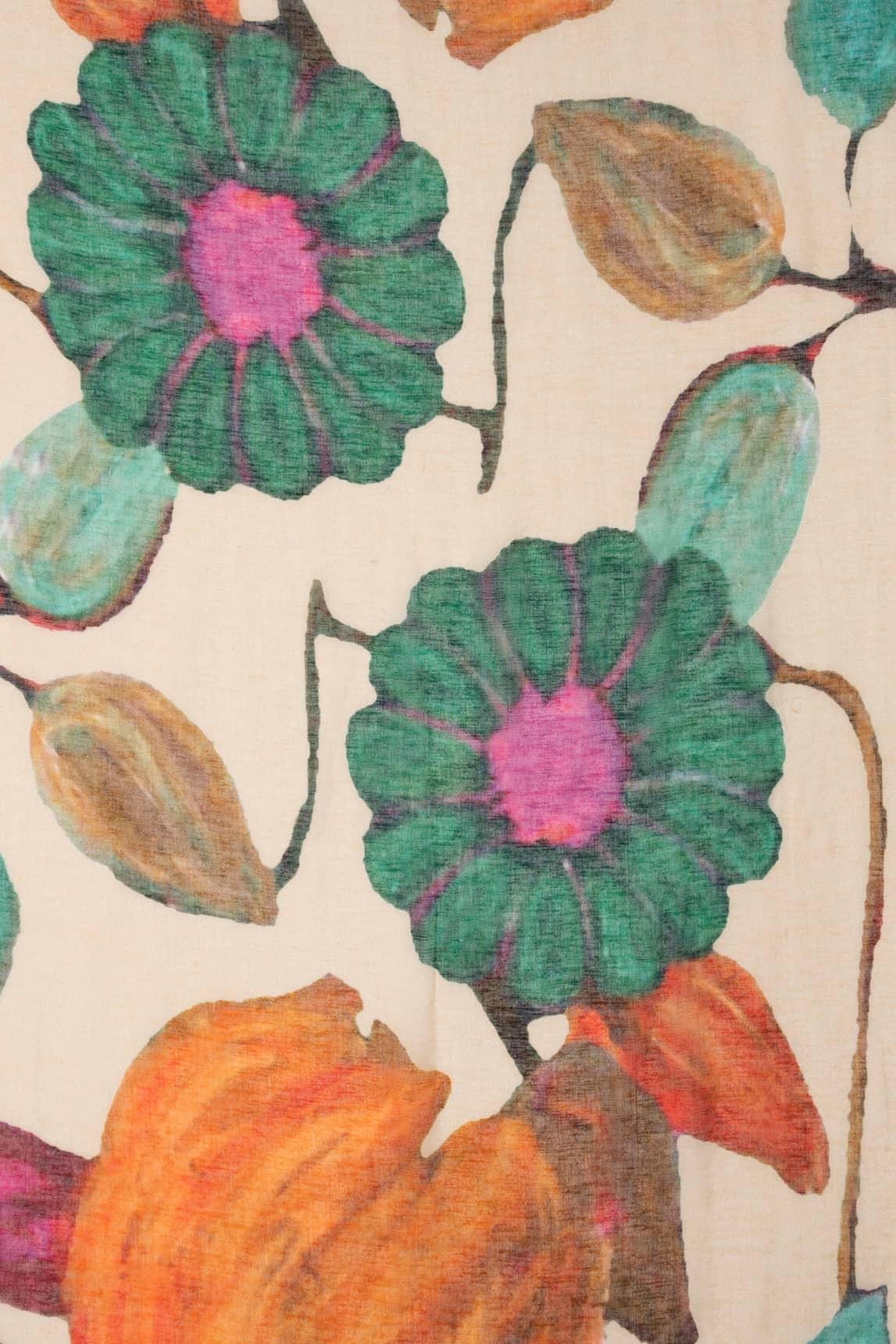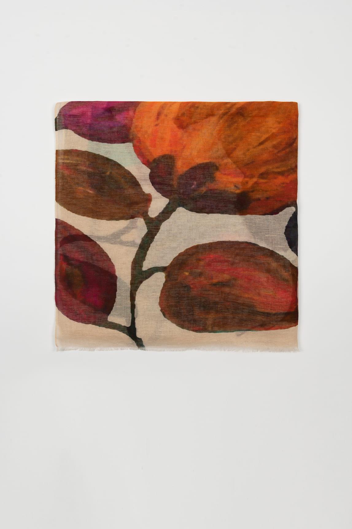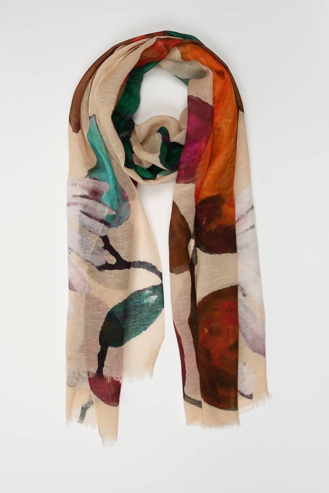 El fular Arhena Natural presenta un estampado artístico de gran formato con pinceladas orgánicas en tonos verde esmeralda, coral tostado y matices tierra sobre una base beige cálida. El contraste entre las formas fluidas y el fondo neutro crea un equilibrio sofisticado y contemporáneo.