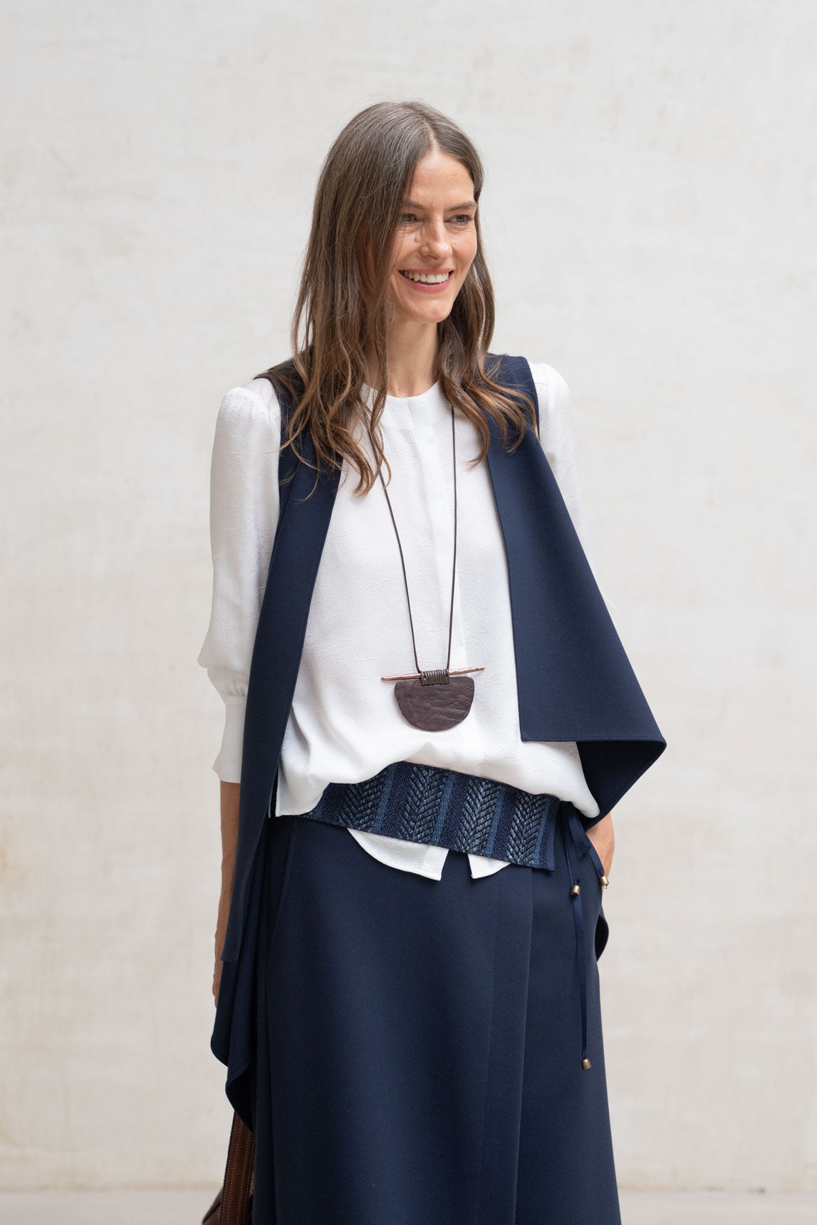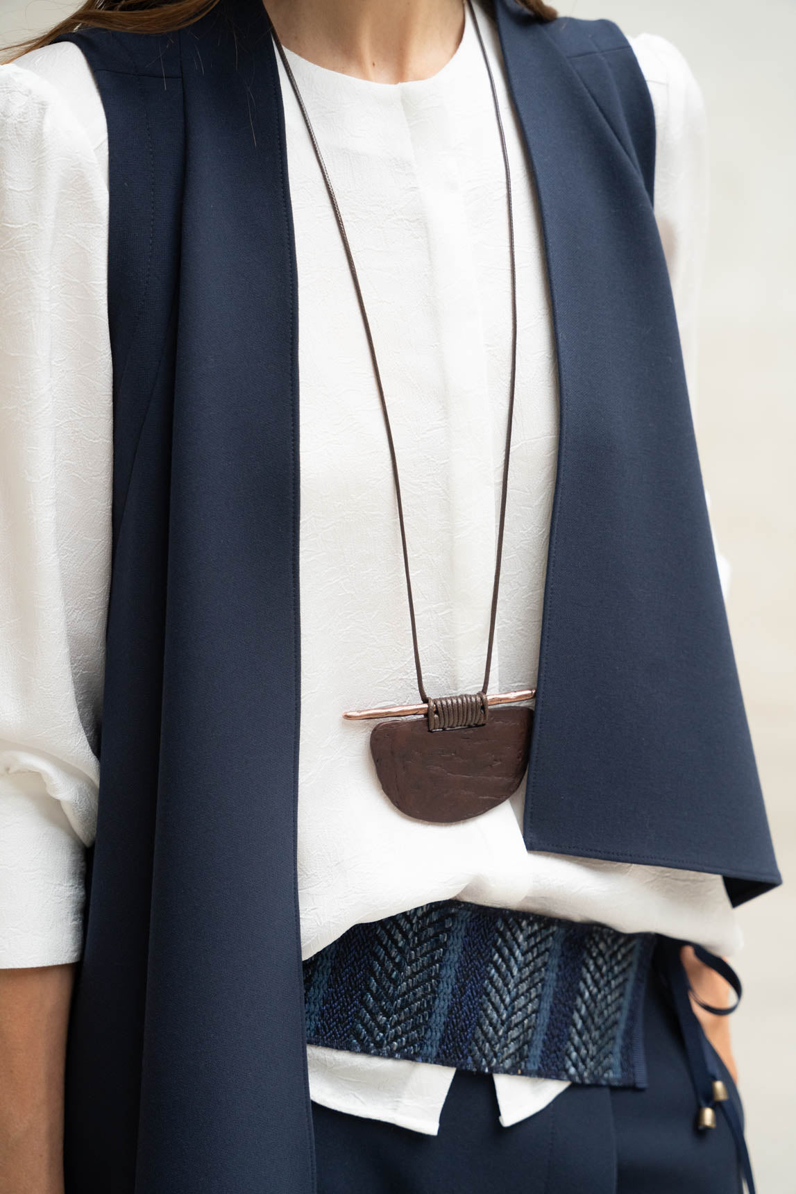 Esta faixa é um item essencial para o outono-inverno. Com um estampado espinha de peixe em azul-marinho, preto e detalhes em cinzento, acrescenta profundidade visual e textura a qualquer look. As fitas de gorgorão azul-marinho com acabamento metálico permitem um fácil ajuste na cintura, realçando a silhueta com um toque de elegância. O seu interior forrado garante conforto para o dia a dia. Ideal para complementar casacos, camisas ou vestidos com um toque sofisticado e contemporâneo.
