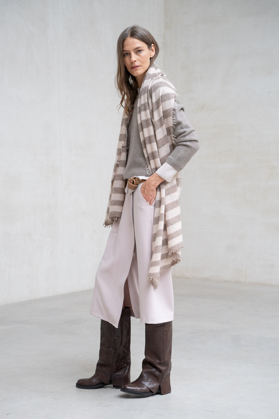 Descubra o cachecol às riscas bege da Rivera, um design inspirado no inverno com riscas largas em bege e cinzento-claro. Fabricado em caxemira, oferece uma textura envolvente perfeita para aquecer e manter a leveza. O seu padrão listrado na diagonal acrescenta dinamismo e combina facilmente com peças lisas ou em tons terra. As bordas franjadas proporcionam um acabamento descontraído que reforça o seu carácter casual e natural. Uma opção versátil e funcional para o dia a dia, ideal como acessório para looks urbanos, neutros ou boémios.
