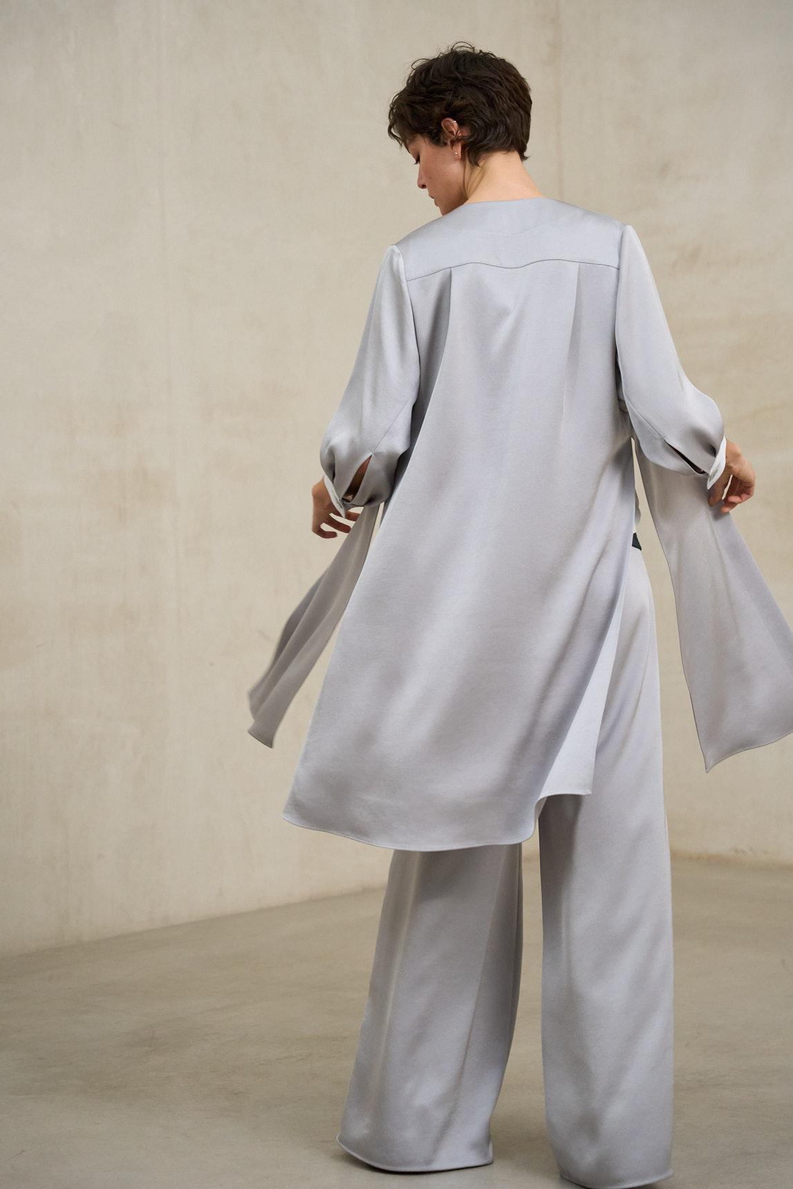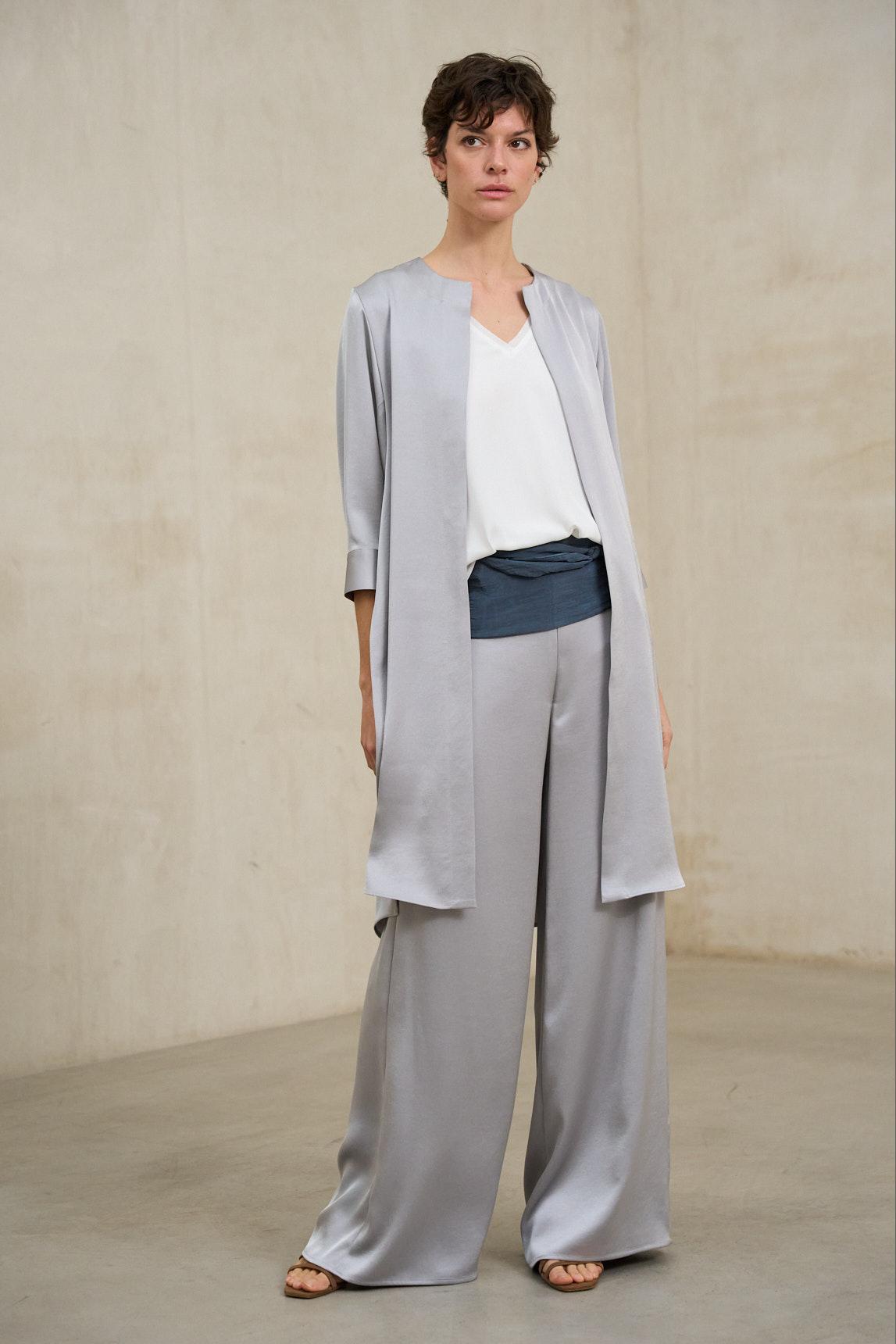 La levita Náyade gris azulado es una prenda exterior ligera y sofisticada que estiliza la silueta gracias a su diseño abierto y su caída vertical. Confeccionada en tejido fluido, presenta un largo por debajo de la cadera que aporta movimiento y elegancia sin añadir rigidez.
