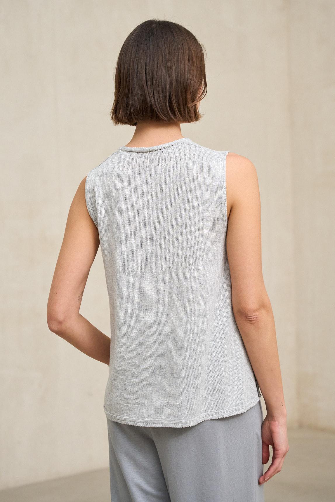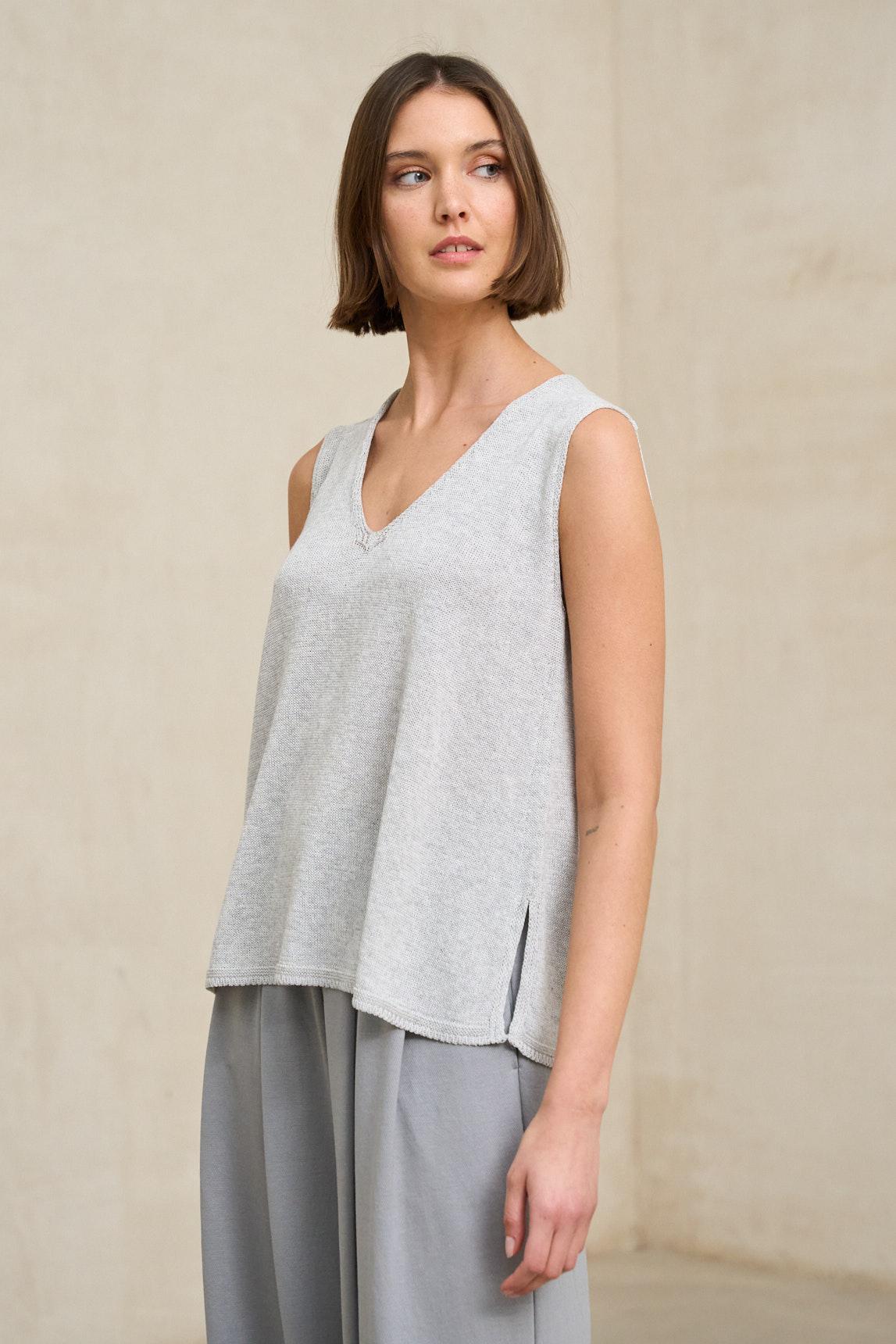 É uma peça perfeita como uma elegante blusa sem mangas para a primavera e o verão, tanto para looks descontraídos com calças largas como para produções mais sofisticadas combinadas com saias fluídas ou casacos leves.