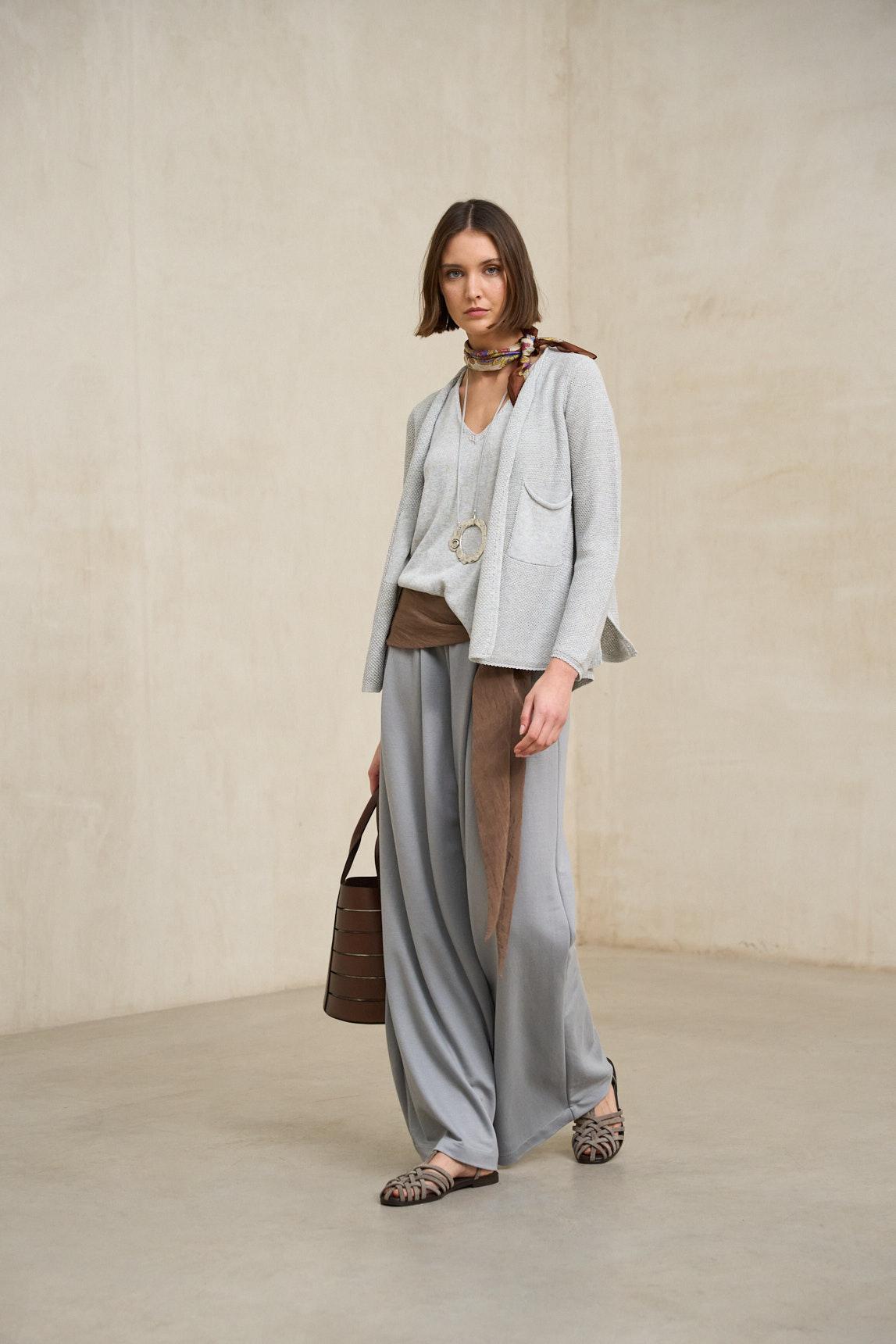 Confecionada num tecido de malha fluido e com um caimento suave, esta peça apresenta um corte ligeiramente evasé que realça a silhueta e acrescenta movimento. O tom cinzento claro, quente e versátil, combina especialmente bem com tons de branco, terra, azul-marinho ou looks monocromáticos em tons neutros.