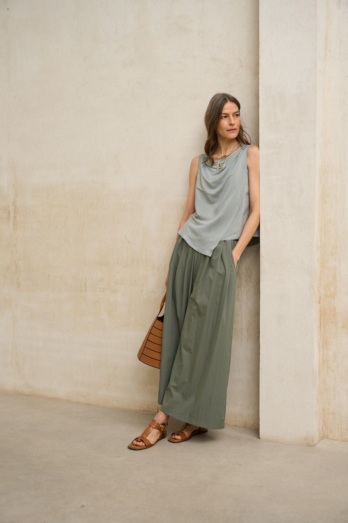 A blusa Nireya num tom cinzento-azulado mantém a silhueta fluida e o decote delicadamente drapeado que definem o design. O seu tecido leve proporciona movimento e uma sensação de leveza que favorece um caimento natural e confortável.