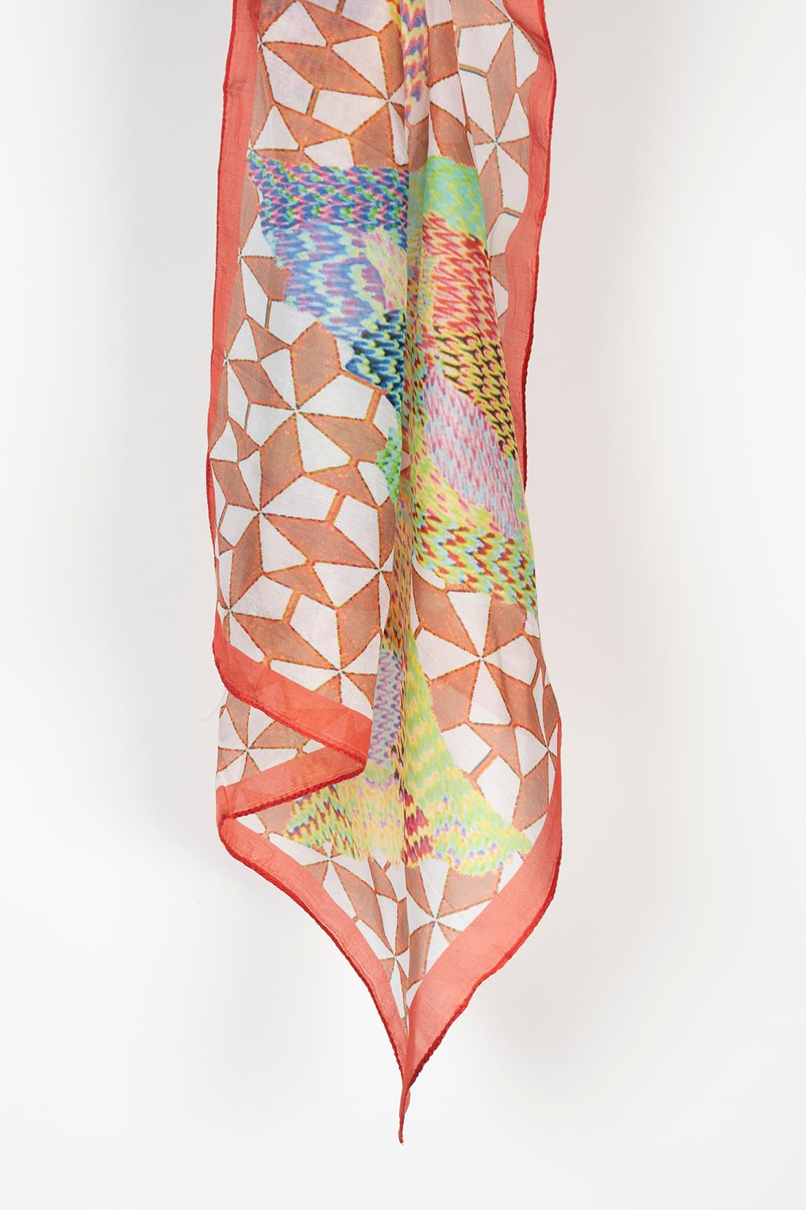 Um lenço leve e arejado com uma base clara e um padrão geométrico em mosaico em tons quentes. Um detalhe vibrante e multicolorido no centro acrescenta um toque artístico e contemporâneo. O acabamento é feito com uma borda coral que emoldura a peça e realça o seu look, com um caimento fluído ideal para atar sem dar volume.