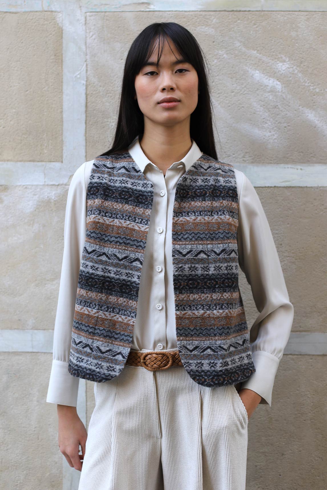 Su corte recto y ligero lo convierte en una prenda versátil para superponer sobre camisas, blusas o vestidos, aportando un toque de color y originalidad a cualquier look. El chaleco Urbino gris combina calidez y estilo, ideal para la temporada de otoño e invierno.