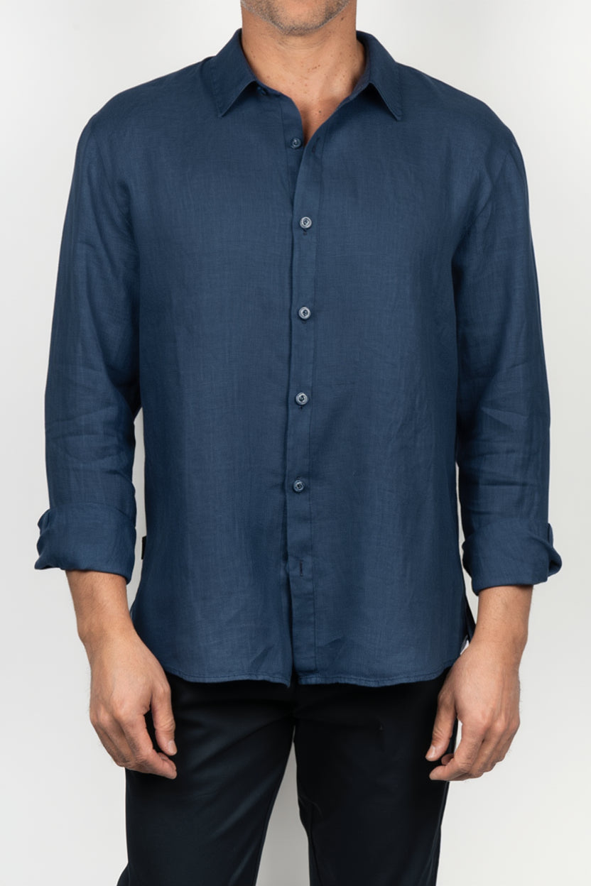 Camisa de hombre de manga larga en azul marino, con silueta recta y una superficie de textura arrugada que aporta movimiento visual y un acabado natural. El diseño incorpora cuello clásico, cierre frontal de botones al tono y puños abotonados, manteniendo una imagen limpia con un punto desenfadado. La estructura ligera favorece una caída cómoda y convierte el color oscuro en una base sobria con más profundidad.