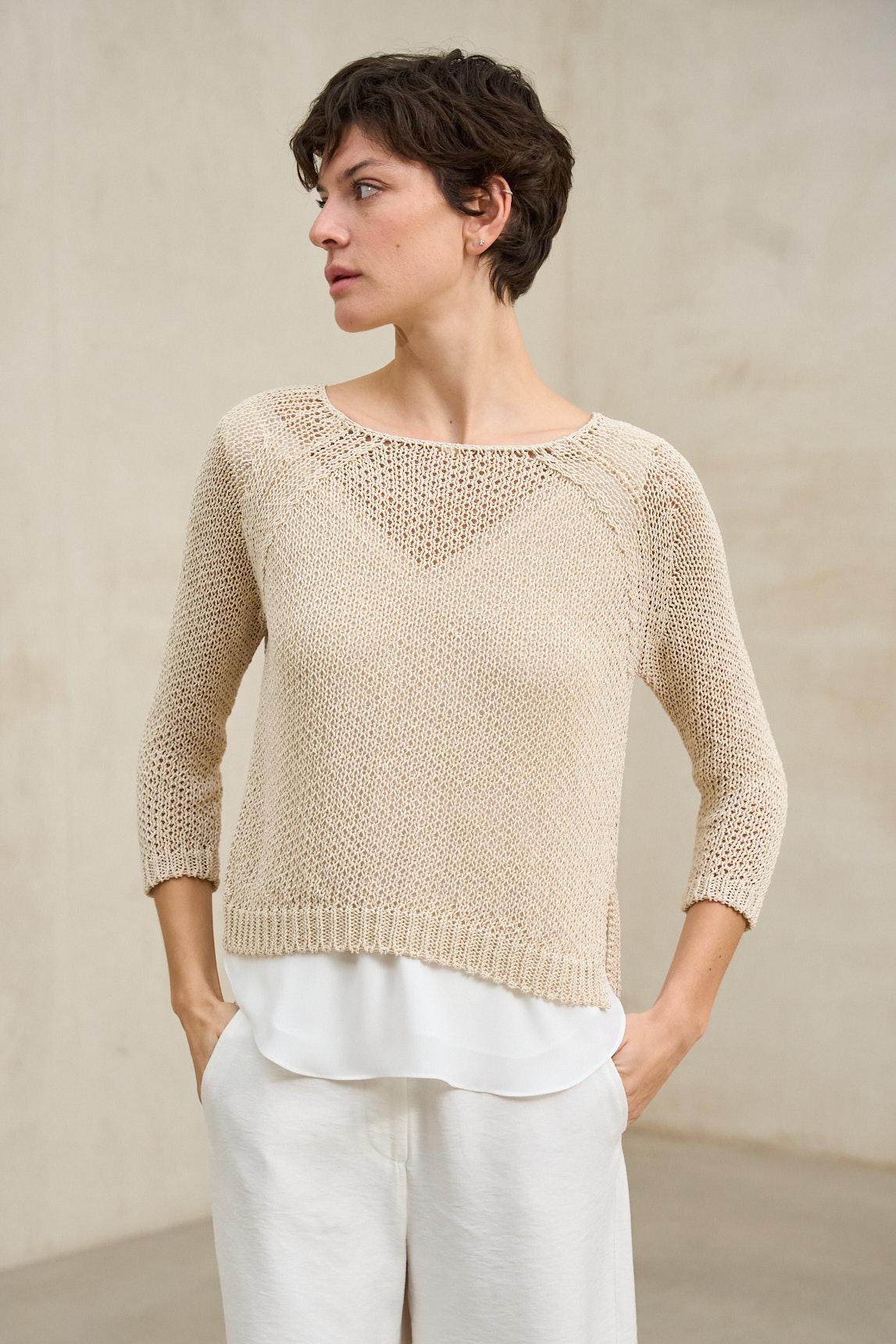 A camisola Évela bege areia combina a leveza de um tecido de malha fina com delicados detalhes vazados na parte superior, acrescentando textura e profundidade visual. O seu tecido subtilmente translúcido cria um efeito leve e etéreo; recomenda-se a sua utilização com uma blusa por baixo (não incluída), como a blusa Alenia off-white, para um acabamento natural e equilibrado. A peça apresenta um decote amplo e mangas a três quartos, com uma estrutura suave que acompanha os movimentos do corpo sem restringir os movimentos. A sua silhueta descontraída torna-a ideal para sobreposições e para criar looks com tons neutros. O tom bege arenoso transmite aconchego e harmonia, combinando especialmente bem com calças fluidas em tons cru, verde-azeitona ou terra. Uma peça versátil, ideal para um guarda-roupa sereno e sofisticado. Esforçamo-nos por exibir as cores da forma mais precisa possível, mas podem variar ligeiramente da realidade.