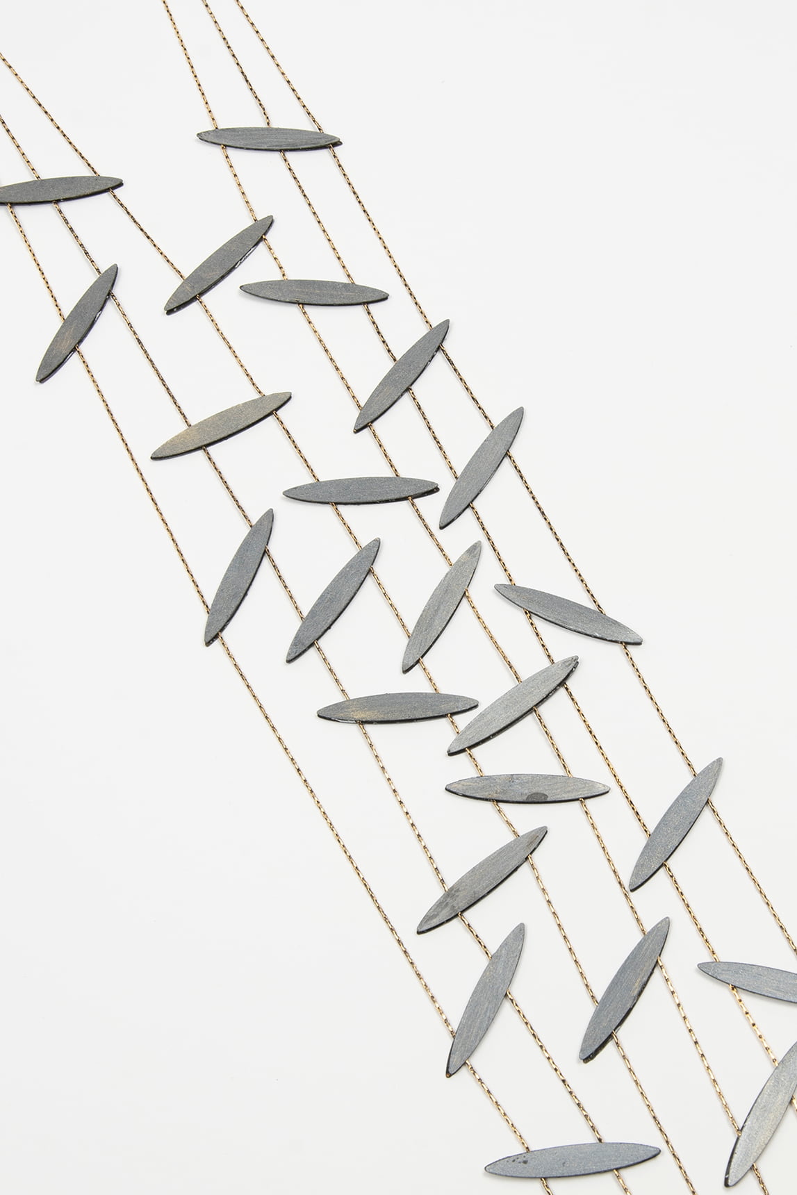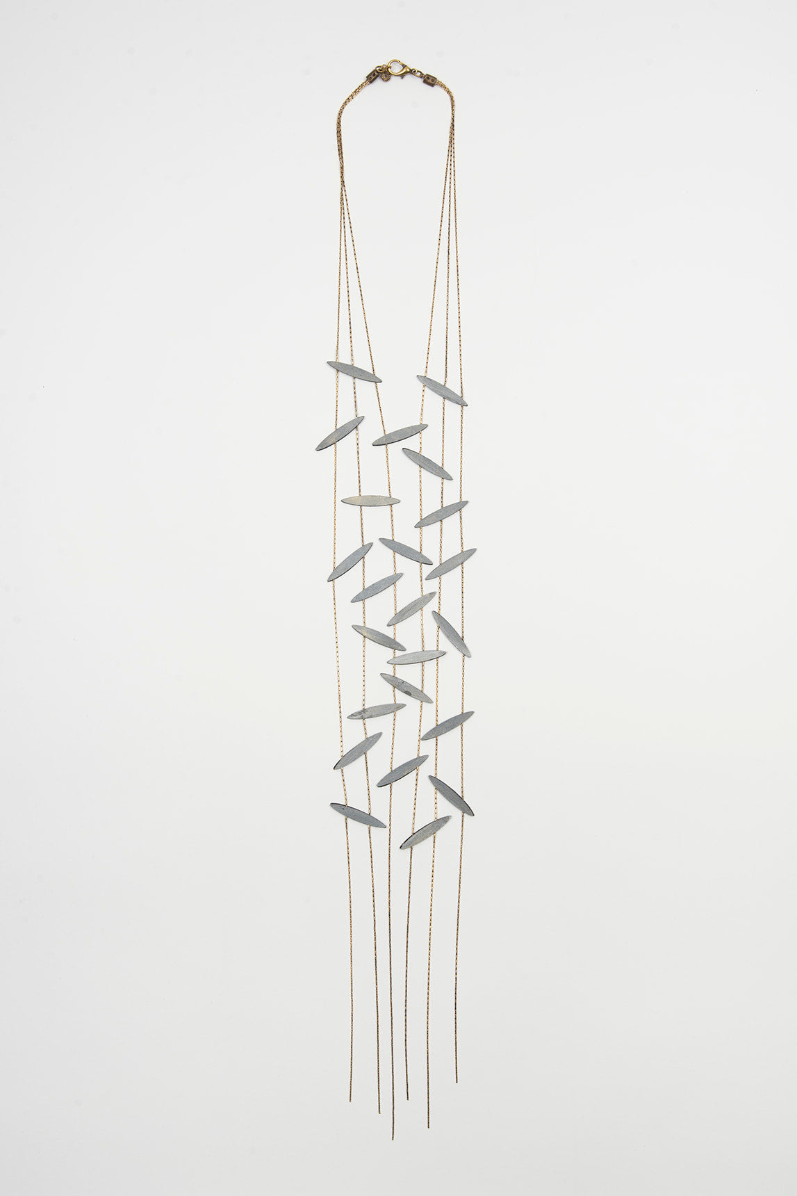 Este colar comprido destaca-se pela sua estrutura de múltiplos fios dourados em cascata, decorados com ferragens prateadas em forma de cápsula. O seu design etéreo e sofisticado acrescenta movimento e brilho subtil a qualquer look, tornando-o o complemento ideal para estilos monocromáticos, camisas largas ou vestidos fluidos. Uma peça versátil que confere um toque artístico e moderno com um toque artesanal.