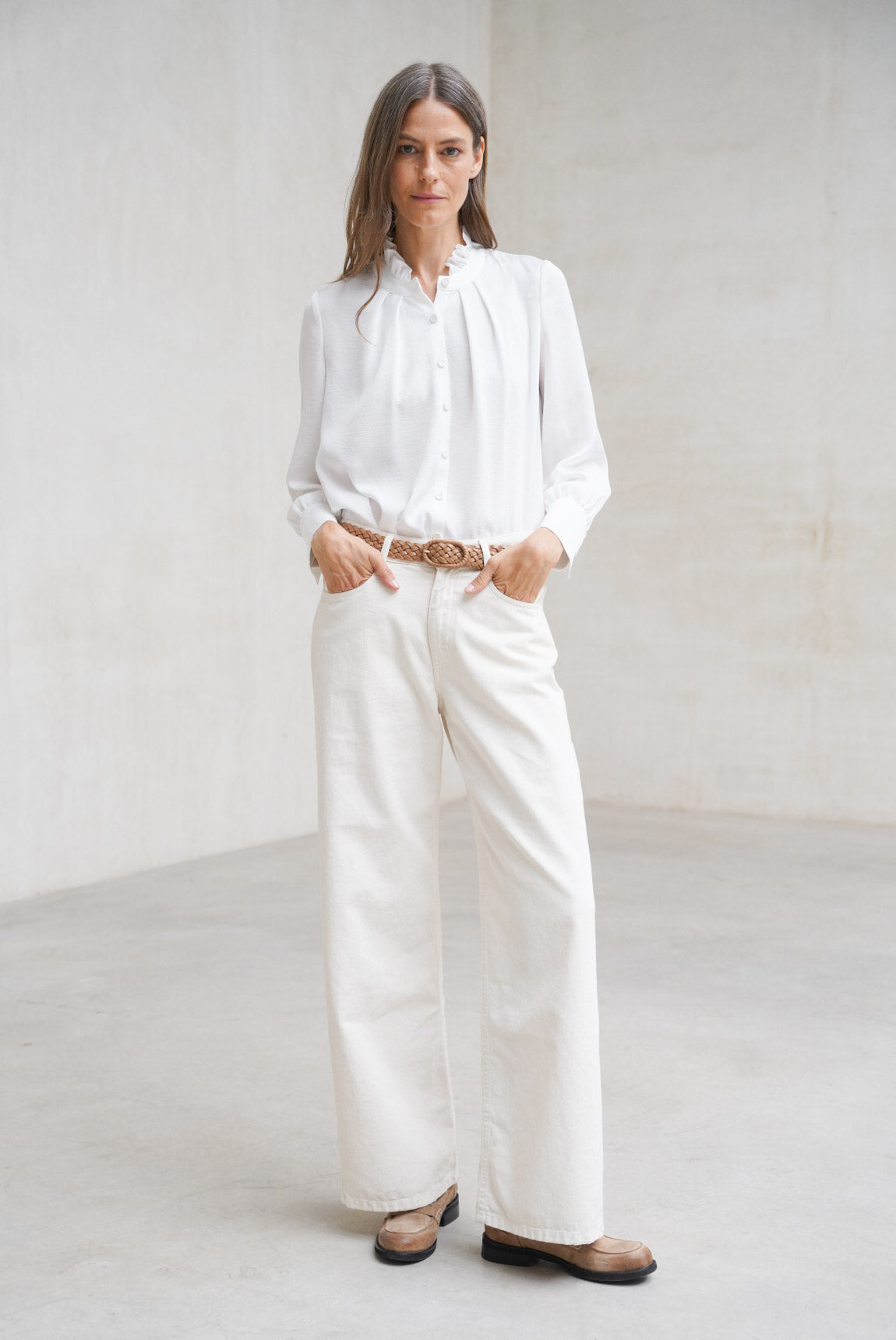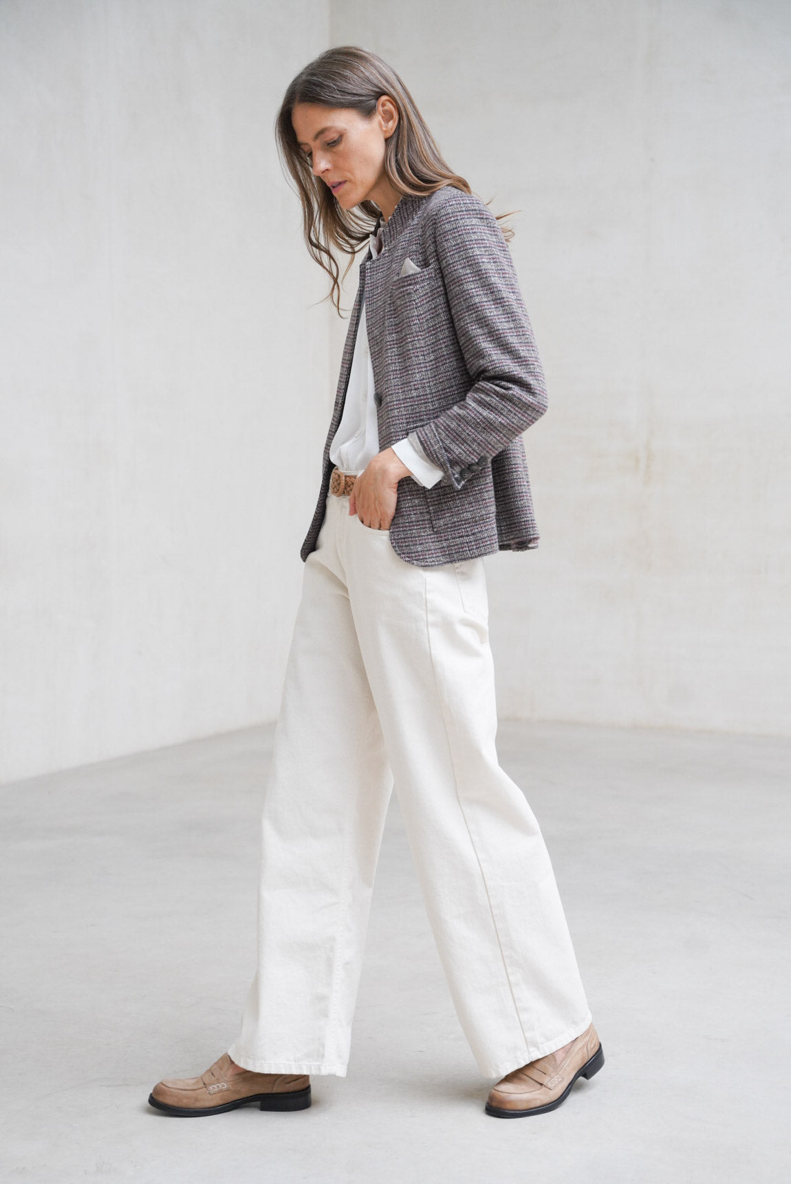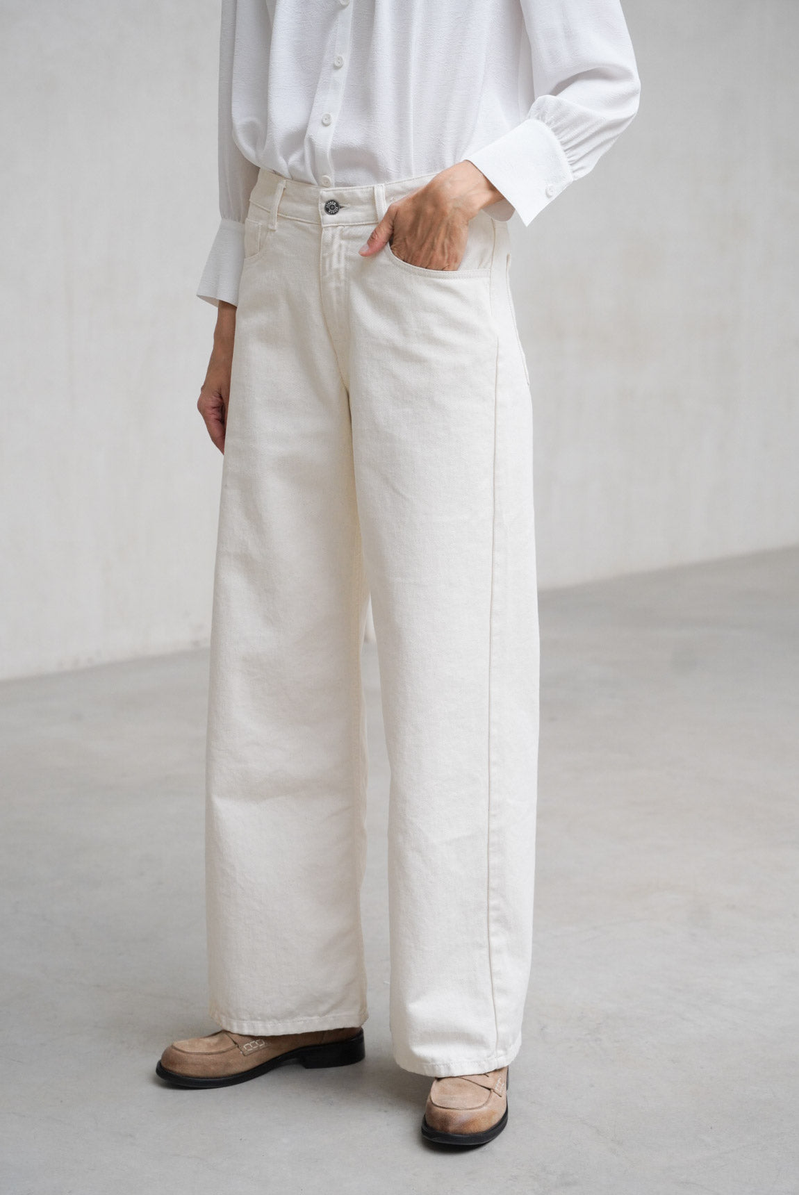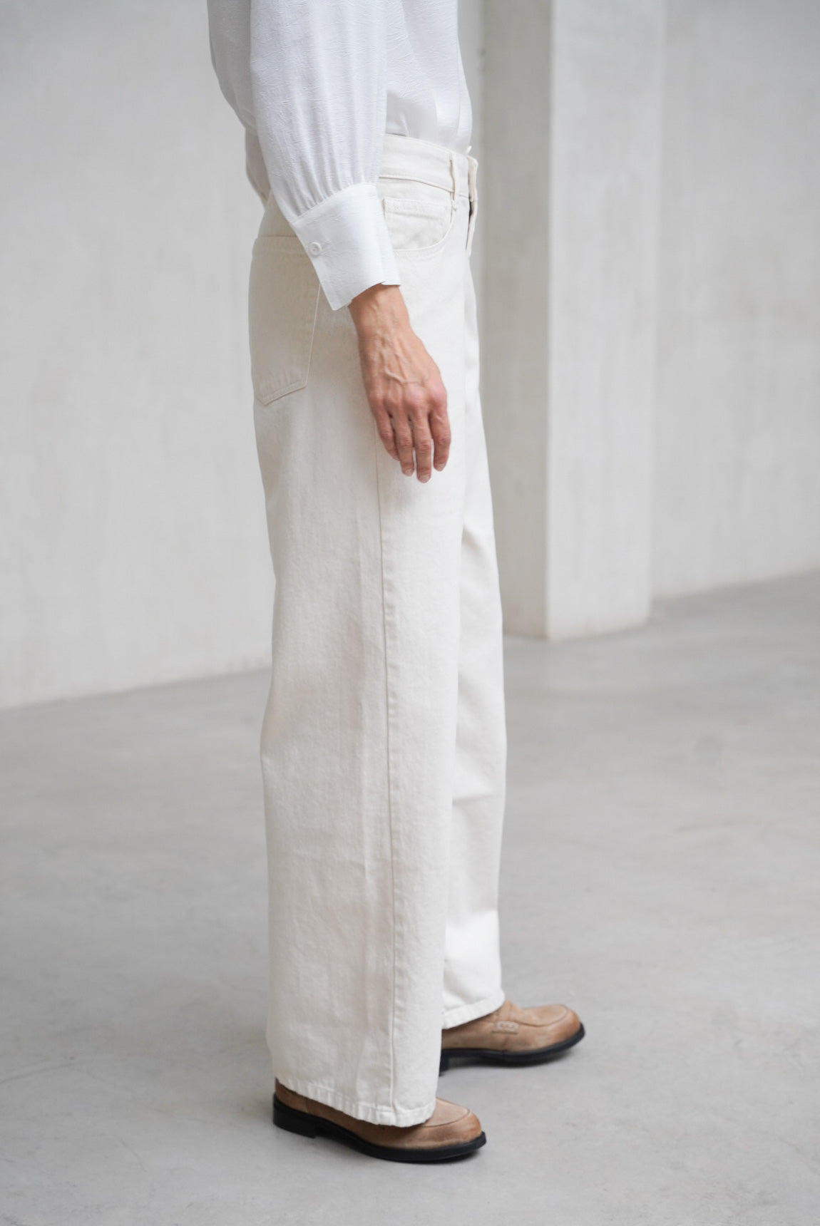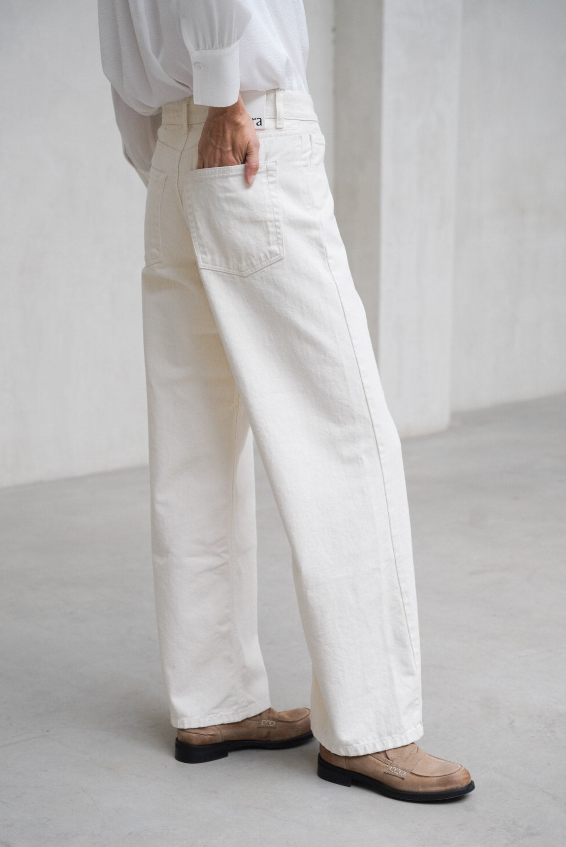 As calças cruas Evoque são uma reinterpretação luminosa do clássico jeans Rivera. Confecionada com tecidos reciclados certificados e fibras sustentáveis, mantém o mesmo design intemporal de cinco bolsos, com uma silhueta direita e uma cintura média. O seu tom suave e neutro torna-a uma peça versátil, perfeita para looks frescos e equilibrados durante todo o ano.
