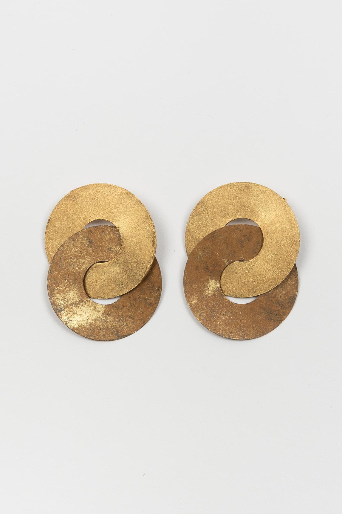 *NO SE ADMITE CAMBIO NI DEVOLUCIÓN DE ESTE PRODUCTO. Pendientes de formato medio con diseño colgante y composición de piezas circulares superpuestas que generan un efecto escultórico y dinámico. Presentan un acabado metálico en tono dorado con superficie ligeramente texturada, lo que aporta un brillo suave y una presencia visual muy equilibrada. La estructura se resuelve con un cierre superior discreto y una silueta vertical de líneas redondeadas, pensada para enmarcar el rostro con naturalidad y movimiento.