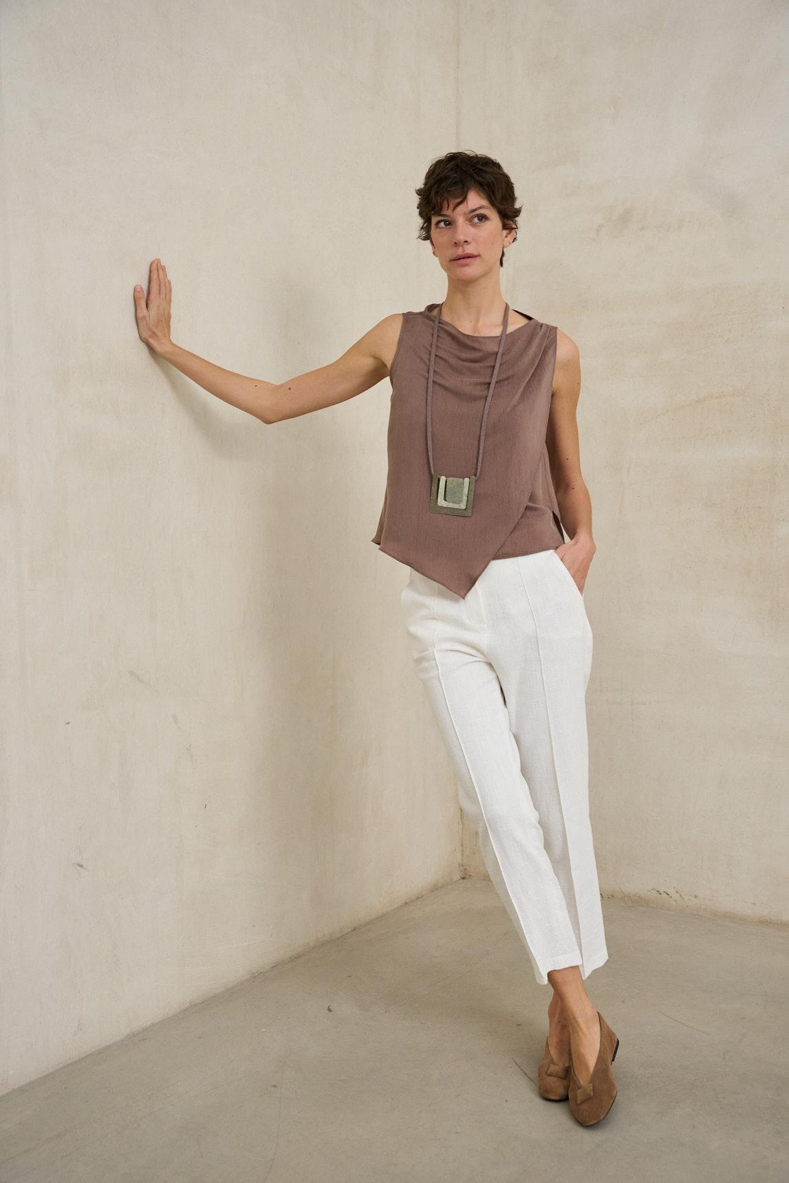 A peça apresenta um decote delicadamente drapeado que acrescenta movimento e um toque elegante sem ser exagerado. O modelo sem mangas realça a silhueta e torna-a uma escolha ideal para os dias quentes ou para usar por baixo de casacos e blazers leves.
