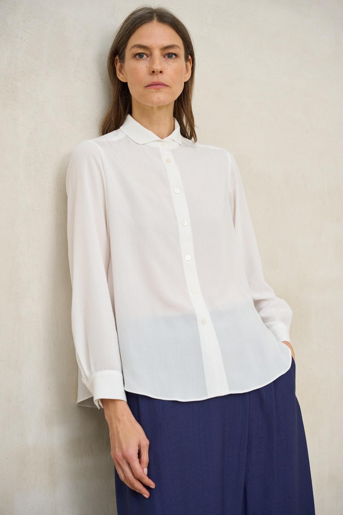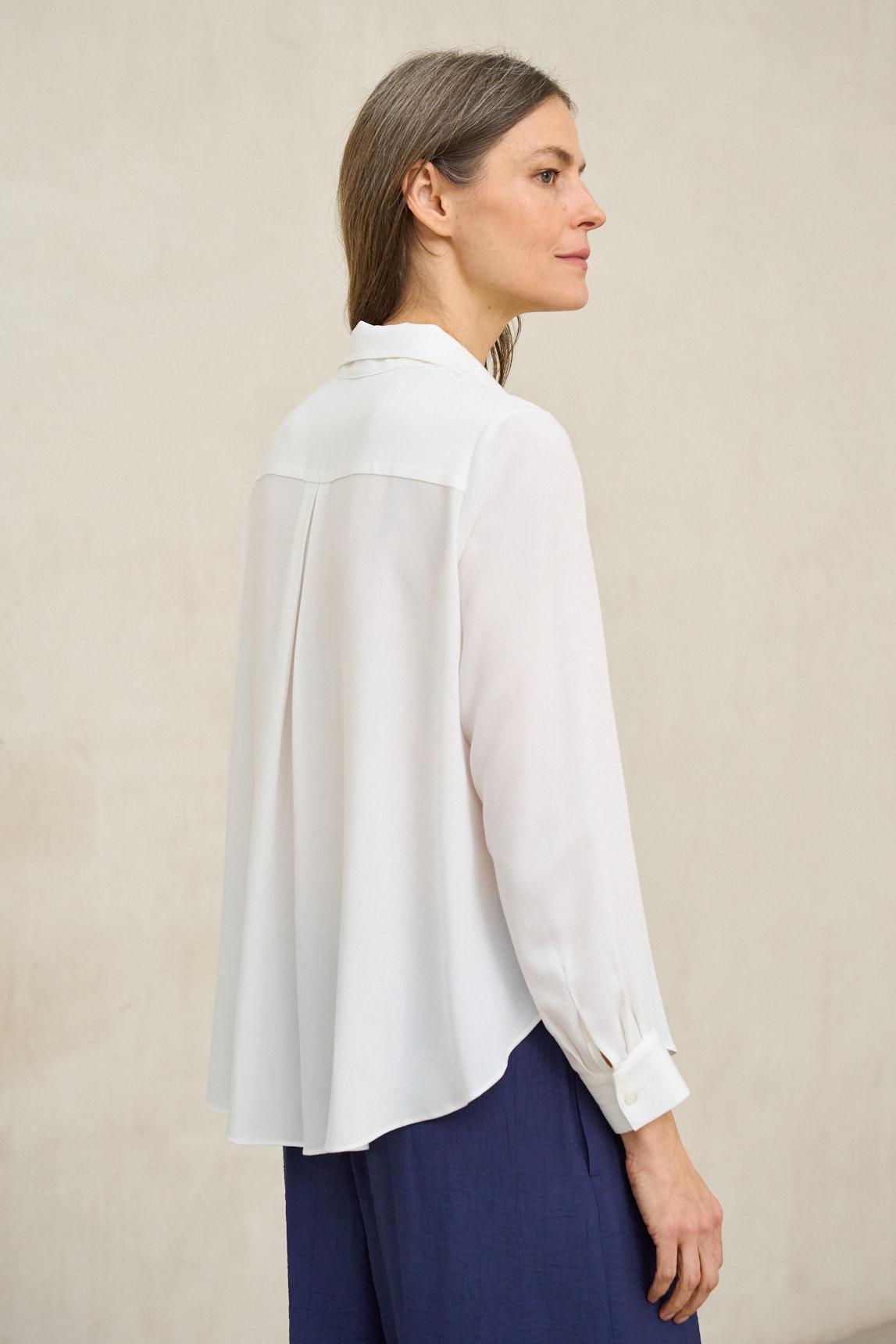 Presenta cuello camisero clásico con escote ligeramente abierto y cierre frontal discreto. La manga larga incorpora puño vuelto en contraste, aportando un detalle sutil que enriquece el diseño sin perder sobriedad. El bajo redondeado tipo camisero suaviza la silueta y permite llevarla tanto por dentro como por fuera.