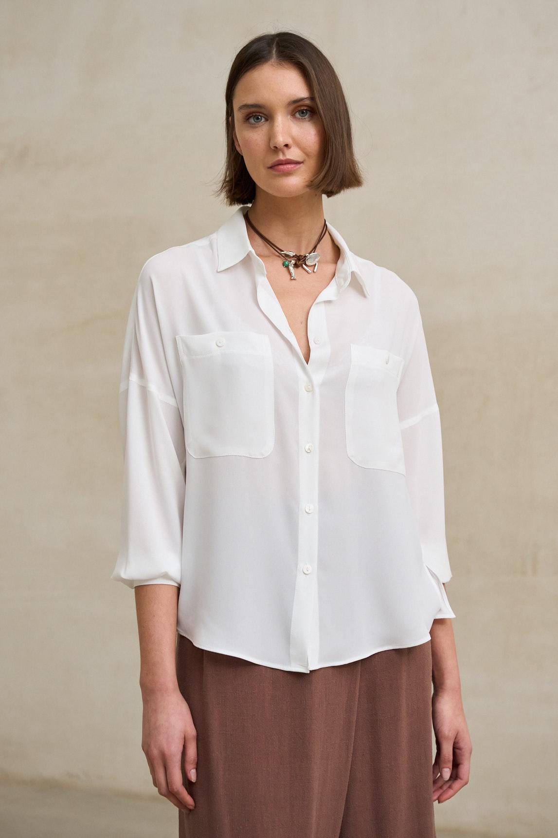 La Camisa Arlen blanco combina la pureza del blanco con una silueta fluida y contemporánea. Confeccionada en tejido ligero y agradable al tacto, presenta cuello camisero, botonadura frontal y manga larga con puño sencillo.