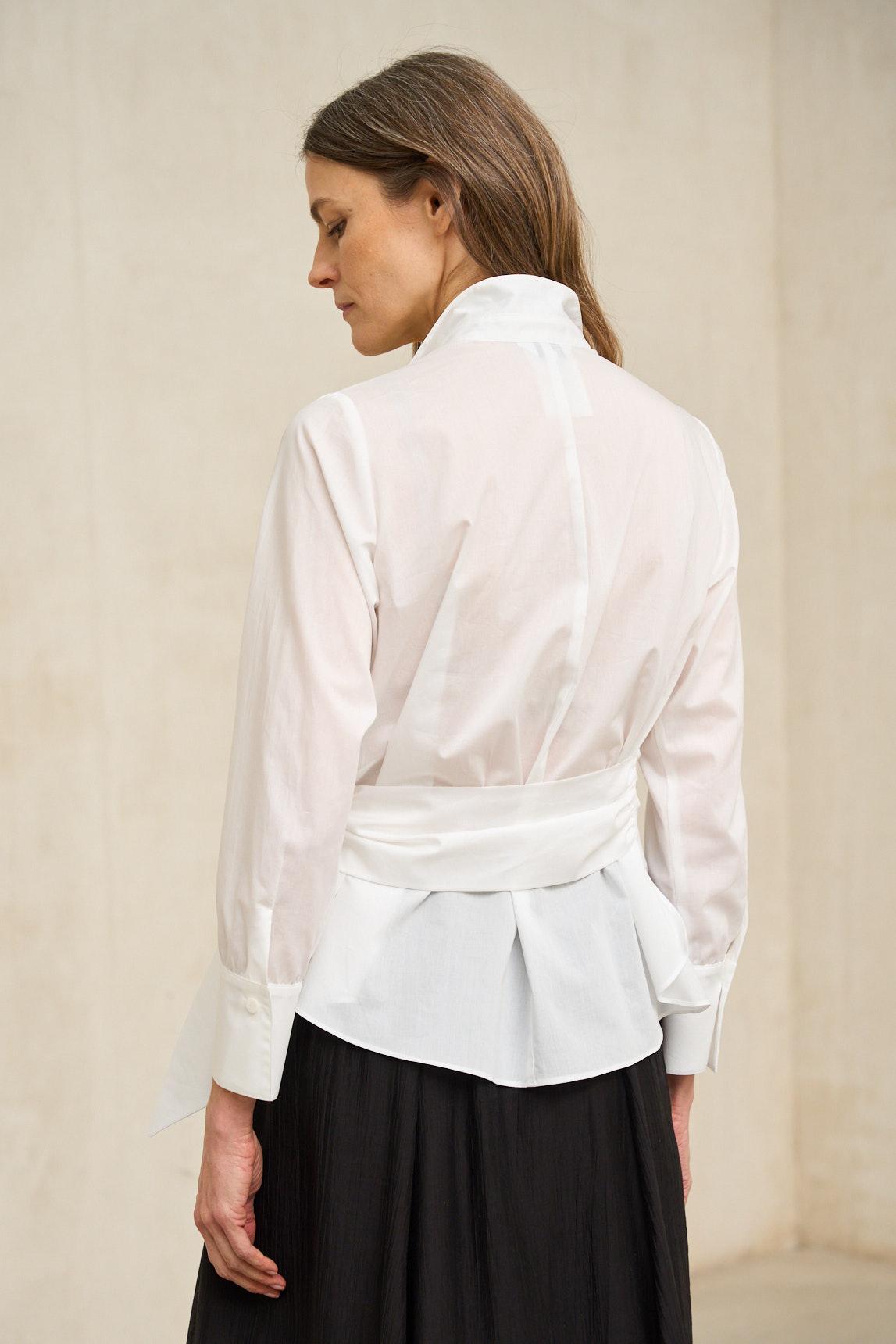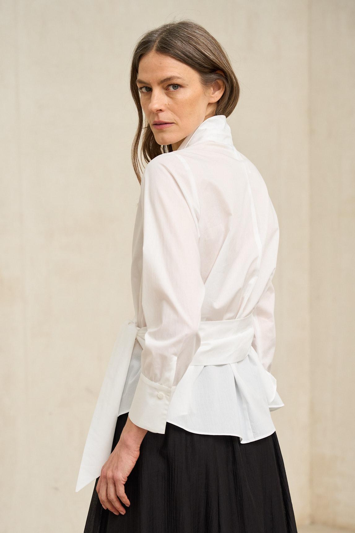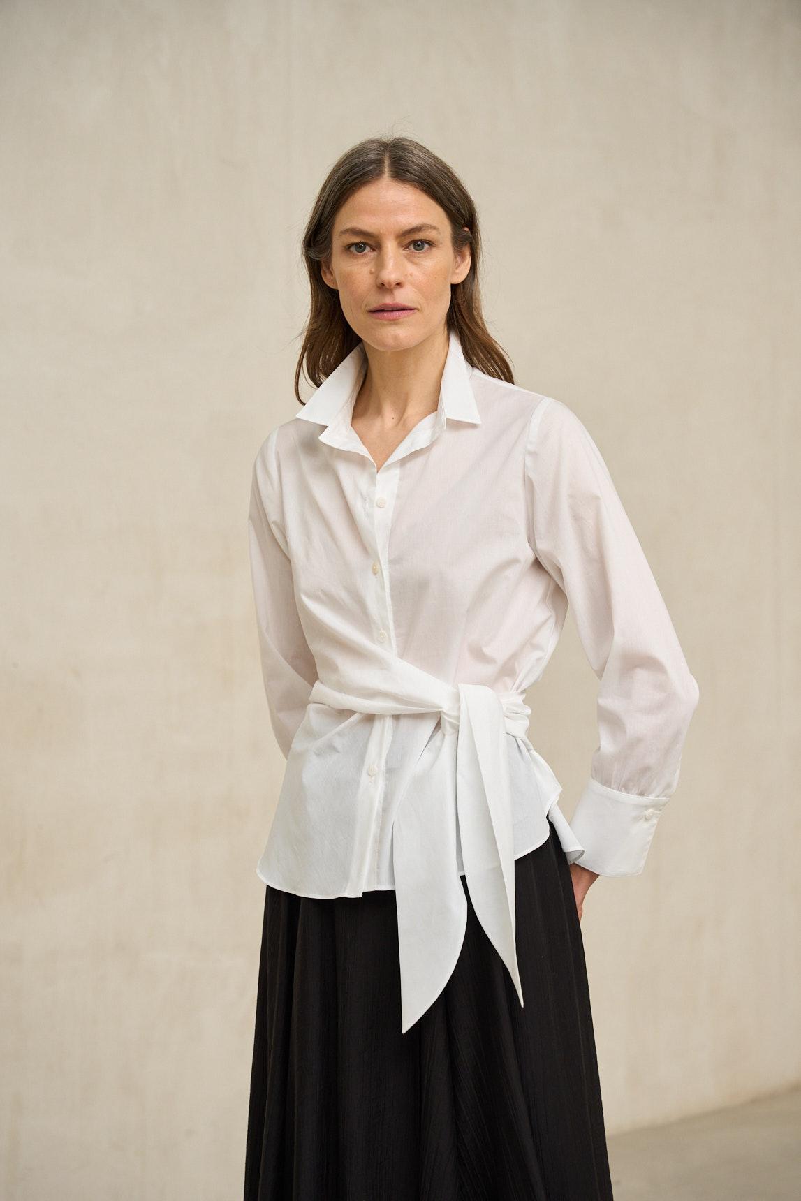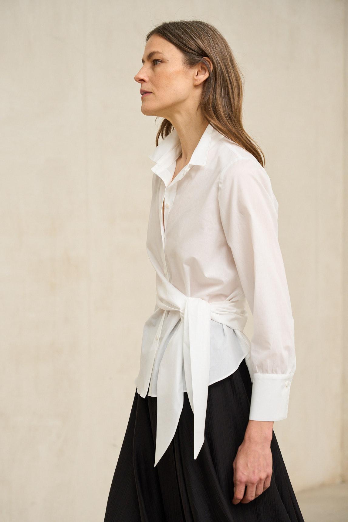 A camisa Vaelia em tom off-white destaca-se pelo seu design trespassado com atilhos laterais, que confere movimento e um toque contemporâneo à silhueta clássica. Fabricada em tecido leve e fluído, apresenta gola de camisa e mangas compridas com punhos, equilibrando a estrutura e a fluidez. O design frontal cruzado alonga visualmente o tronco e permite um ligeiro ajuste da peça com o laço, criando uma silhueta feminina sem causar uma sensação de aperto. A bainha ligeiramente assimétrica acrescenta dinamismo e facilita a combinação com calças de corte direito e silhuetas mais largas. O tom off-white acrescenta luminosidade sem a frieza do branco ótico, combinando na perfeição com looks neutros, como o preto, o camel, o areia ou o cinzento claro. É uma peça versátil que funciona tanto em ambientes formais como em visuais urbanos sofisticados. Uma camisa única e elegante que eleva qualquer look sem perder a sofisticação. Esforçamo-nos por exibir as cores da forma mais precisa possível, mas podem variar ligeiramente da realidade.