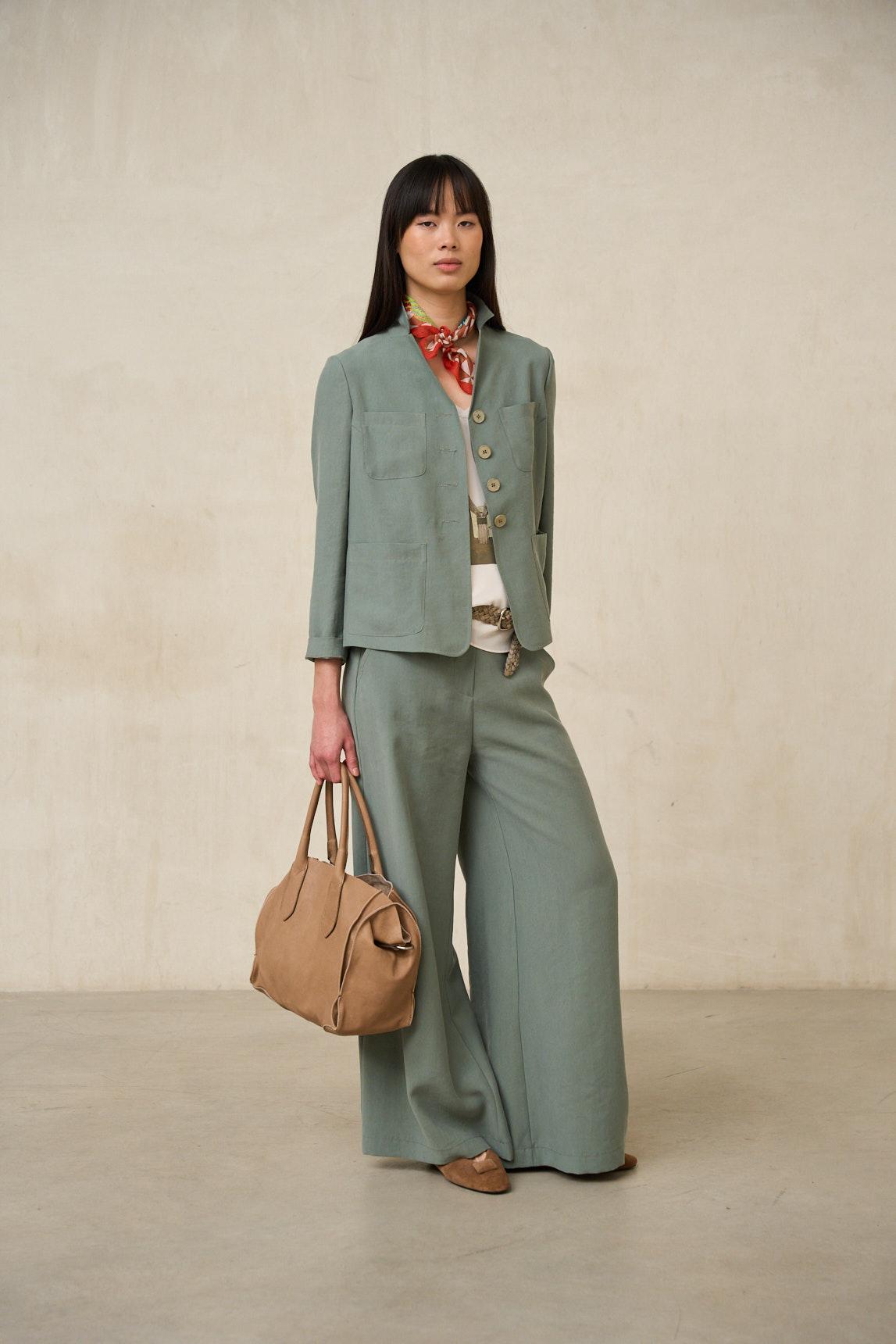 Chaqueta de mujer confeccionada en tejido con textura arrugada de aspecto natural. Presenta cuello solapa, cierre frontal con botones al tono y dos bolsillos de plastrón amplios que aportan funcionalidad al diseño. La manga larga y el bajo ligeramente recto mantienen su estructura fluida, ofreciendo comodidad y ligereza en el día a día. La Chaqueta Alva verde salvia conserva la estética contemporánea y relajada del modelo original, reinterpretada en un tono inspirado en la naturaleza. Puede llevarse como prenda principal o como sobrecamisa ligera, ideal para estilismos de entretiempo combinada con pantalones fluidos, lino o denim. Su color verde salvia aporta profundidad y versatilidad, funcionando especialmente bien con gamas neutras como crudo, beige o arena. Una pieza equilibrada que combina naturalidad y elegancia discreta, perfecta para un armario atemporal. Nos esforzamos por mostrar los colores de la forma más fiel posible, pero pueden variar ligeramente respecto a la realidad.