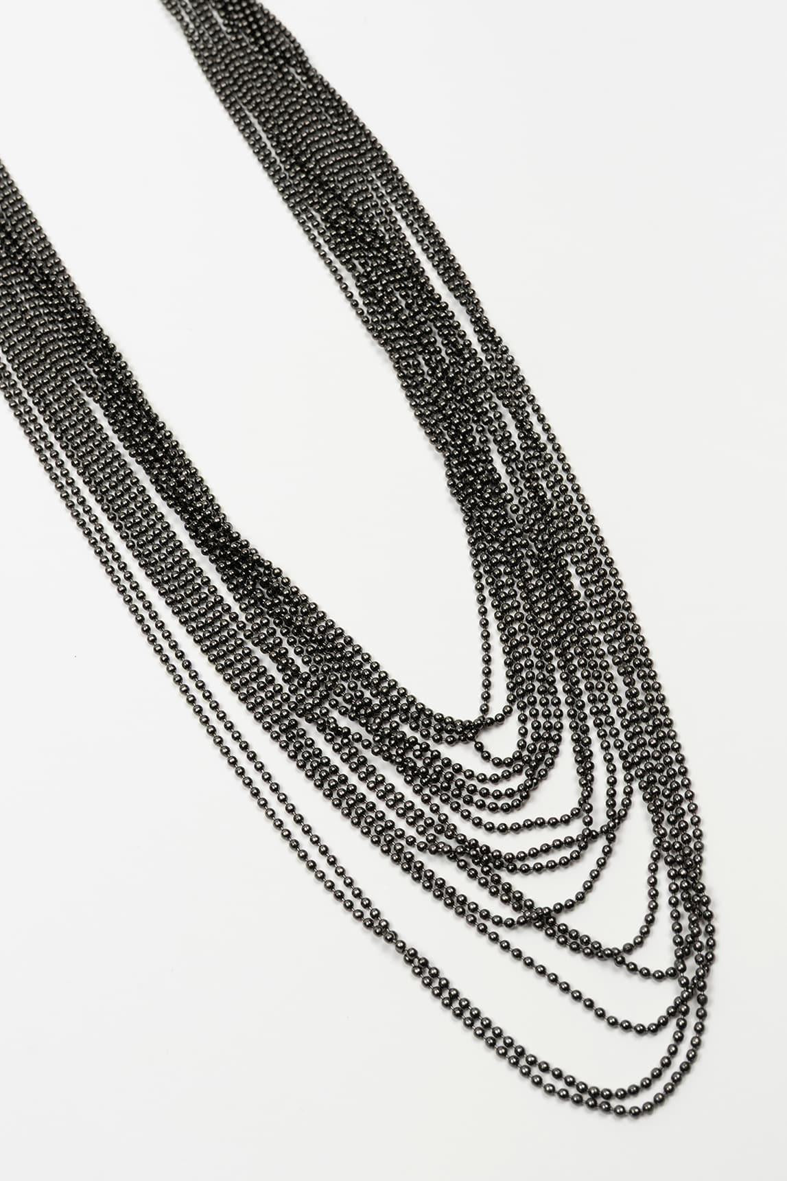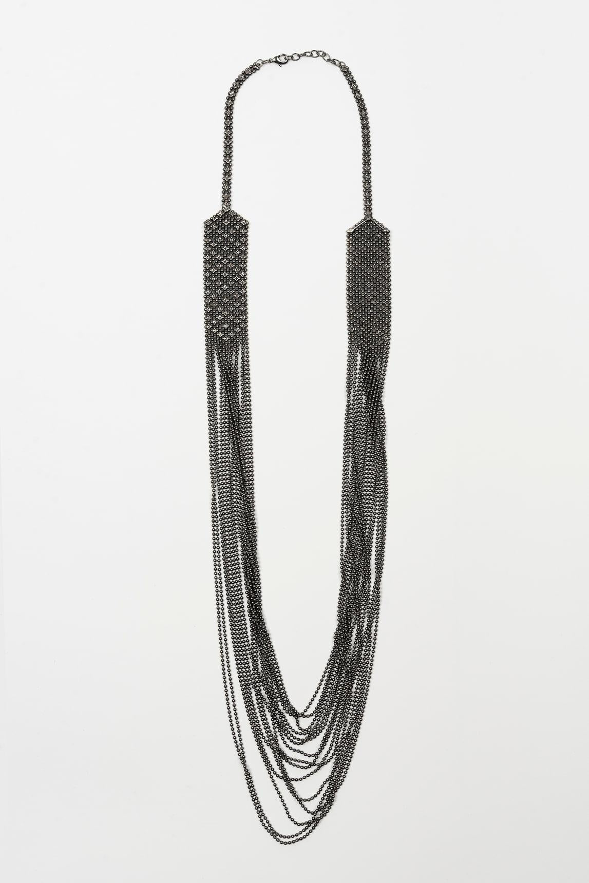 El collar Valeris en acabado antracita presenta la misma composición de cadenas escalonadas que generan movimiento y una silueta estilizada. Las piezas laterales estructuradas equilibran el diseño y refuerzan su presencia visual.