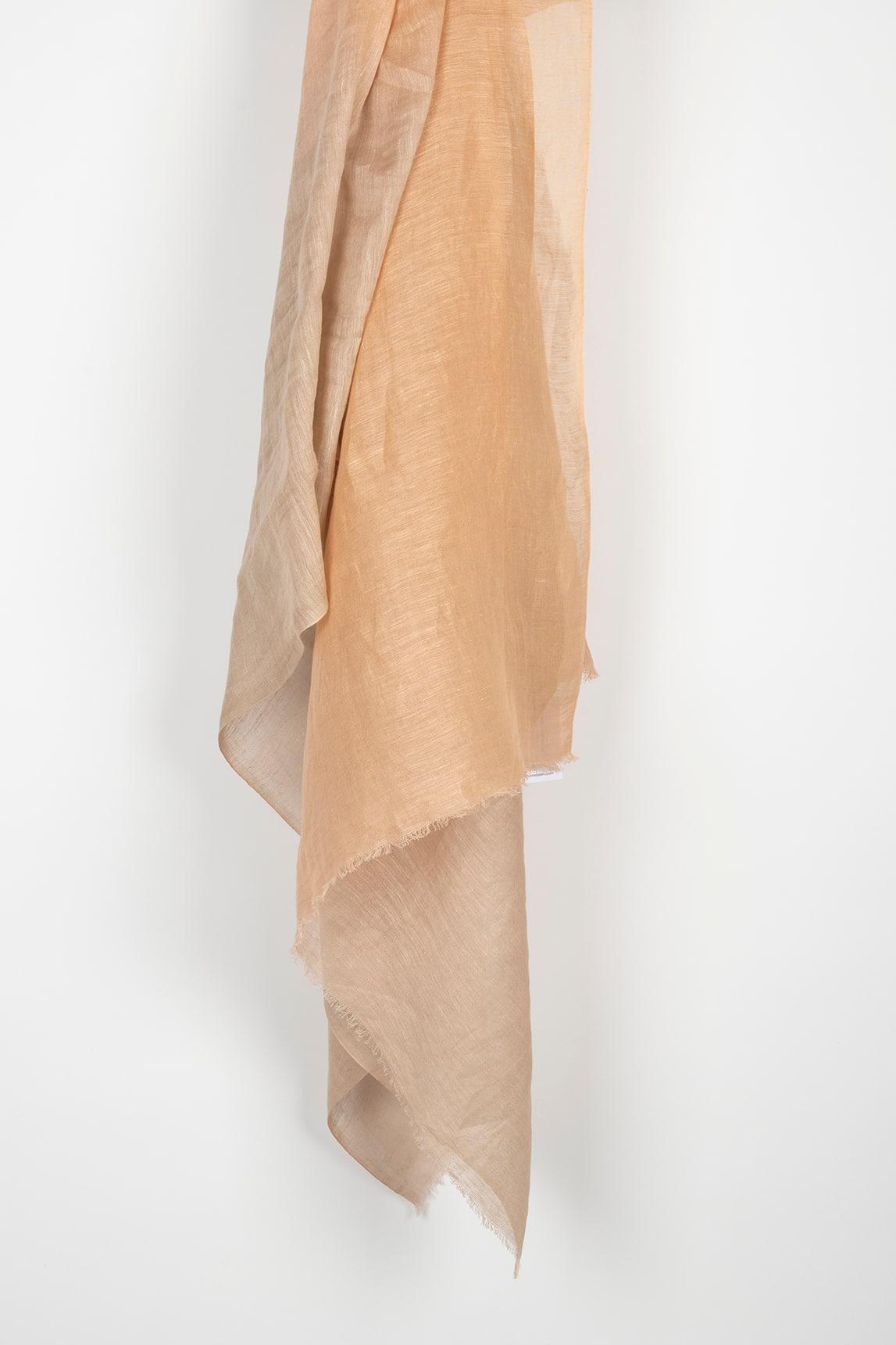 Lenço leve confecionado em 70% linho e 30% algodão, com um acabamento ligeiramente amarrotado e uma delicada transparência que revela a sua textura natural. Apresenta um subtil degradé em tons de bege/areia e bordas limpas com finos fios desfiados que conferem um toque artesanal e descontraído. Com o seu estilo etéreo e minimalista, é a companhia perfeita para a meia-estação e para o verão: drapeada sobre os ombros ao pôr-do-sol, atada ao pescoço em dias de brisa ou como um toque elegante em looks monocromáticos. Acrescenta leveza e suavidade sem ser exagerada, combinando especialmente bem com branco, cru, camel e ganga clara. Esforçamo-nos por exibir as cores da forma mais precisa possível, mas podem variar ligeiramente da realidade.