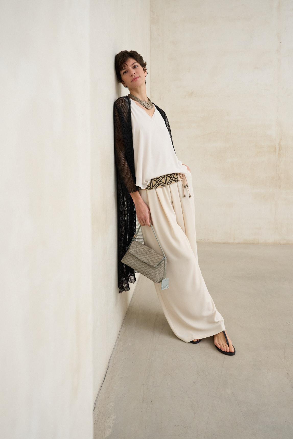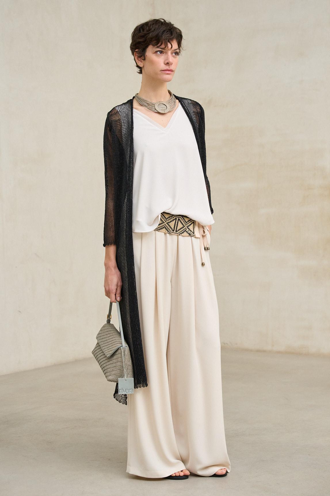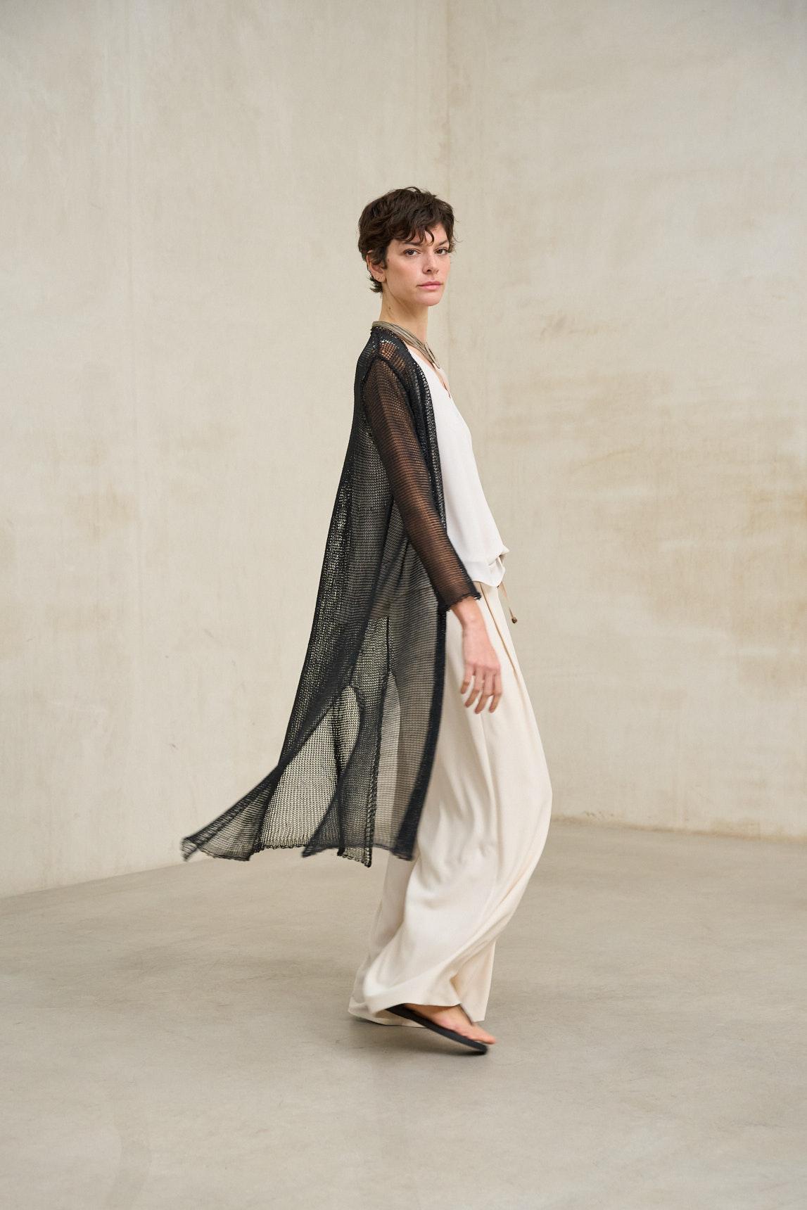 La levita de punto Avenel negro es una pieza ligera y etérea confeccionada en tejido de punto calado con textura abierta, que aporta profundidad visual y movimiento. Su diseño largo y abierto estiliza la figura, creando una línea vertical elegante y fluida. El tejido de punto es sutilmente translúcido, lo que permite jugar con las capas y contrastes. Para un acabado limpio y equilibrado, recomendamos combinarla con un top básico como el Top Alenia blanco roto (no incluido). Las mangas tres cuartos y la caída suave refuerzan su carácter sofisticado y contemporáneo. En negro adquiere una presencia más marcada y versátil, ideal para estilismos monocromáticos o para superponer sobre tonos claros y generar contraste. Perfecta para elevar conjuntos sencillos con un toque ligero y refinado. Nos esforzamos por mostrar los colores de la forma más fiel posible, pero pueden variar ligeramente respecto a la realidad.