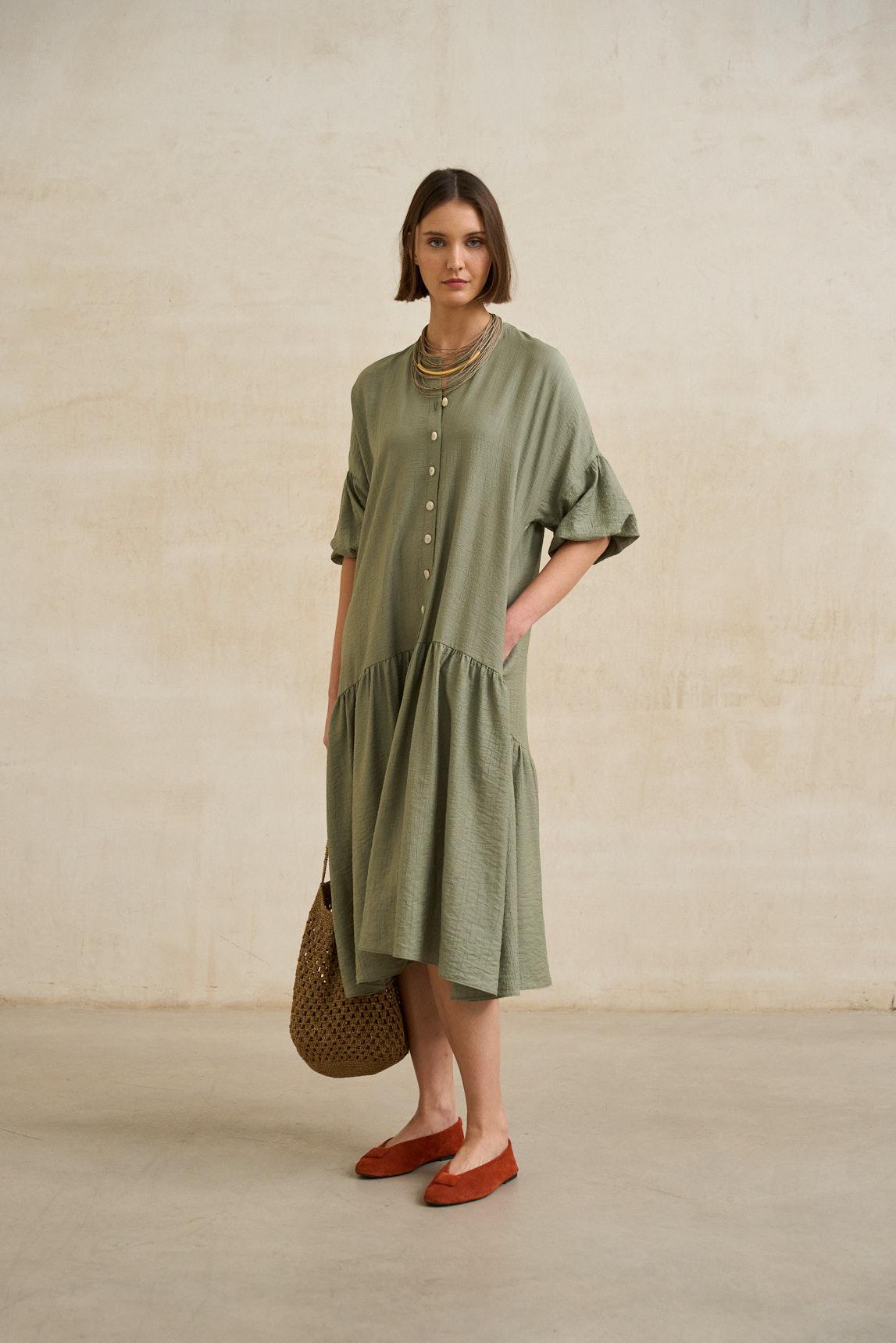 O vestido Arisse verde sálvia combina uma estrutura suave e uma elegância descontraída numa silhueta feminina e fluida. Confecionado em tecido leve com um toque natural, apresenta gola de camisa, fecho frontal completo com botões e mangas curtas subtilmente estruturadas. O modelo apresenta um cós franzido que define a silhueta e proporciona movimento sem necessidade de cinto. Este detalhe cria um caimento amplo e natural na saia, resultando num efeito leve e elegante ao caminhar. O comprimento midi e a fluidez do tecido reforçam o seu carácter versátil e contemporâneo. O tom verde sálvia transmite serenidade e combina naturalmente com acessórios em pele, ráfia ou tons de areia. Pode ser usado com sandálias rasas para um look elegante durante o dia ou com plataformas ou saltos médios para refeições, eventos ou ocasiões especiais. Uma peça feminina e intemporal que equilibra frescura, proporção e leveza com naturalidade. Esforçamo-nos por exibir as cores da forma mais precisa possível, mas podem variar ligeiramente da realidade.